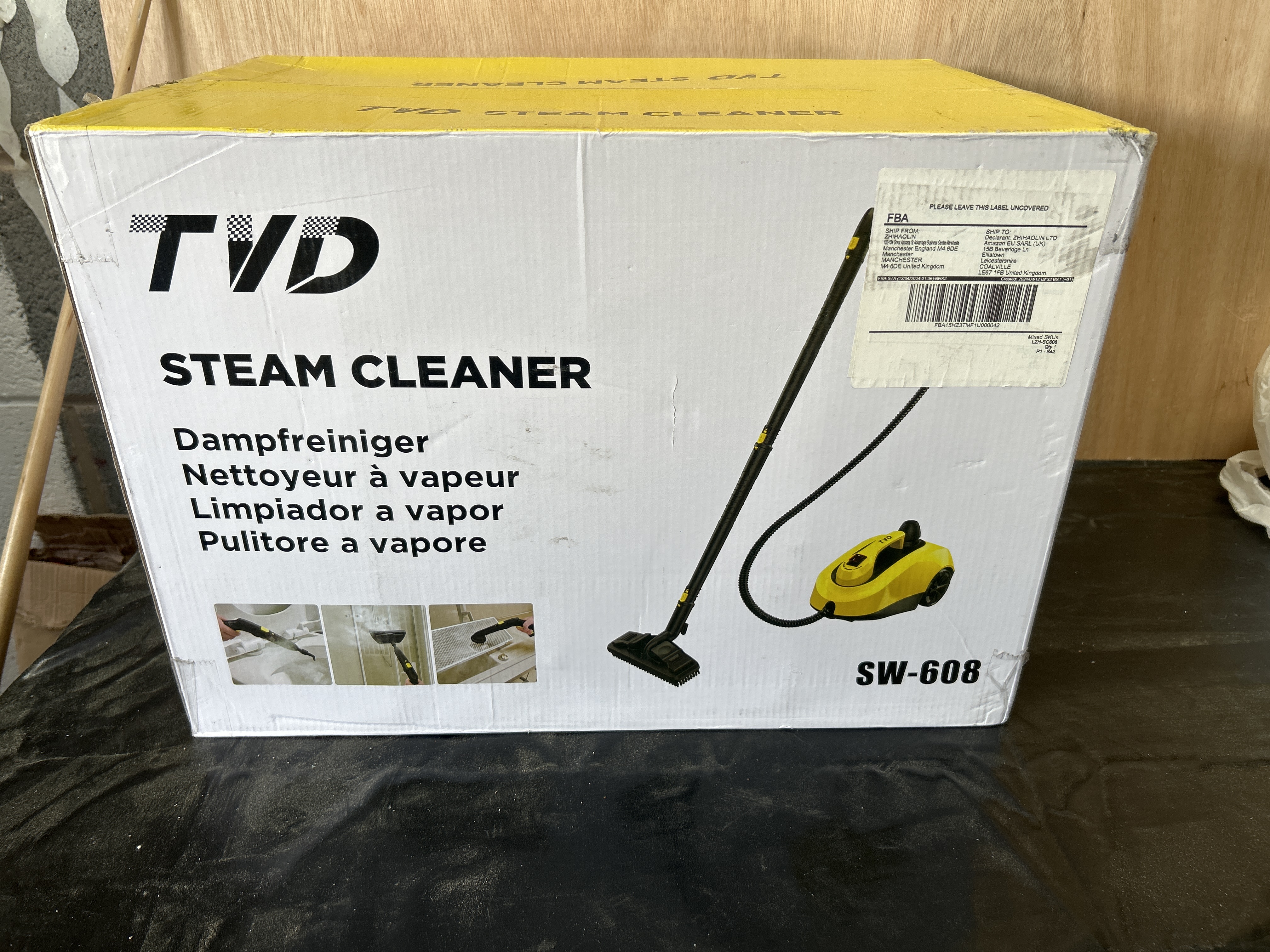 A TVD model SW-608 canister-style steam cleaner. The appliance features a yellow and black plastic housing with a wheeled base for portability. The packaging indicates the unit is supplied with a flexible hose, extension wand, and floor tool for multipurpose cleaning applications including floors, glass, and kitchen surfaces. The manufacturer mark TVD is printed on the box with a distinctive checkered pattern on the upper portions of the letters T and D. The model number SW-608 is marked on the lower right of the front panel.