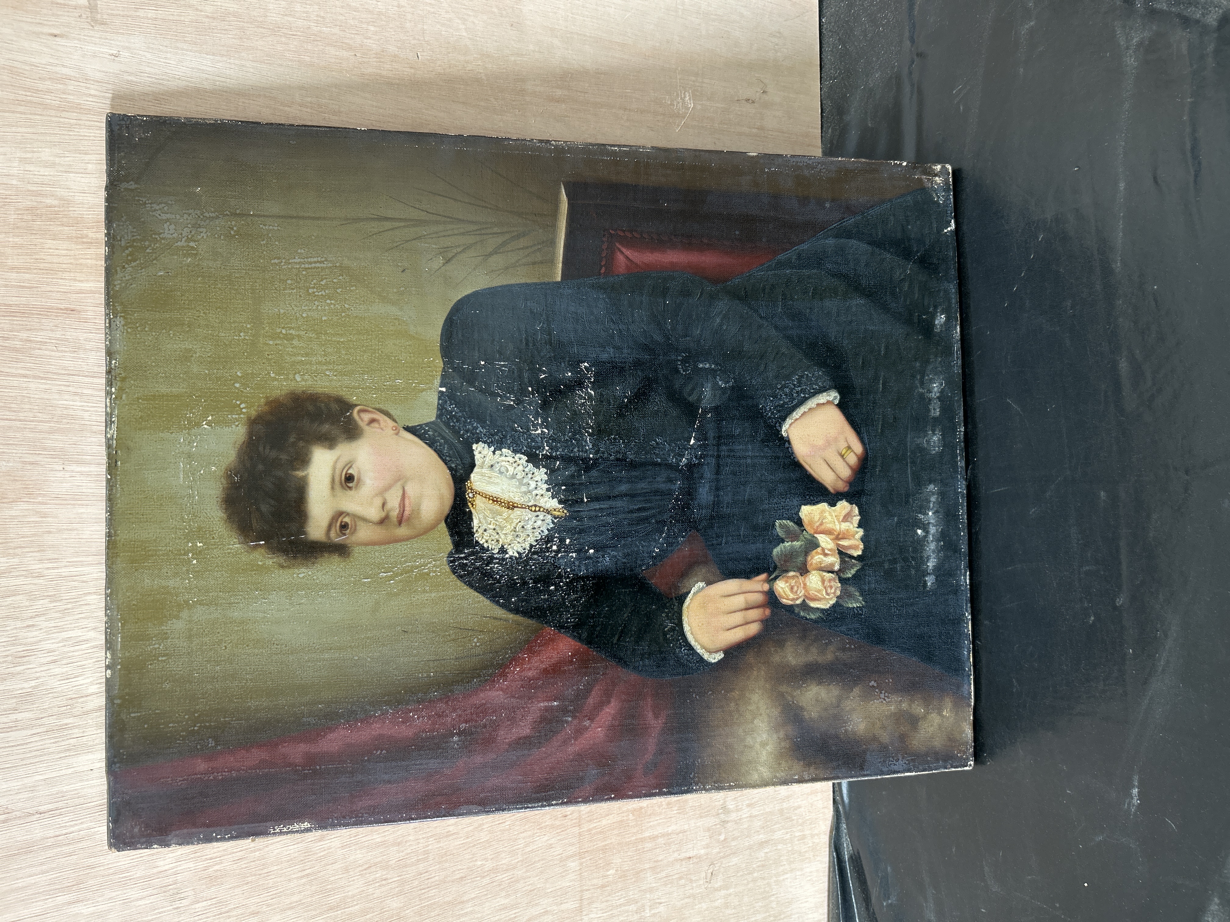 This late 19th-century oil on canvas portrait depicts a seated young woman in three-quarter length, captured in a formal Victorian style. The subject is portrayed with dark, curly hair and a subtle smile, wearing a dark blue-black high-collared dress accented with an intricate white lace jabot and a gold brooch. She holds a small posy of pink roses in her right hand while her left hand rests on her lap, revealing a gold band. The work is executed with a controlled, academic hand, with finer brushwork evident in the lace and floral details. No signature or date is visible on the front of the work. The painting is currently unframed and is executed on a stretched canvas support.