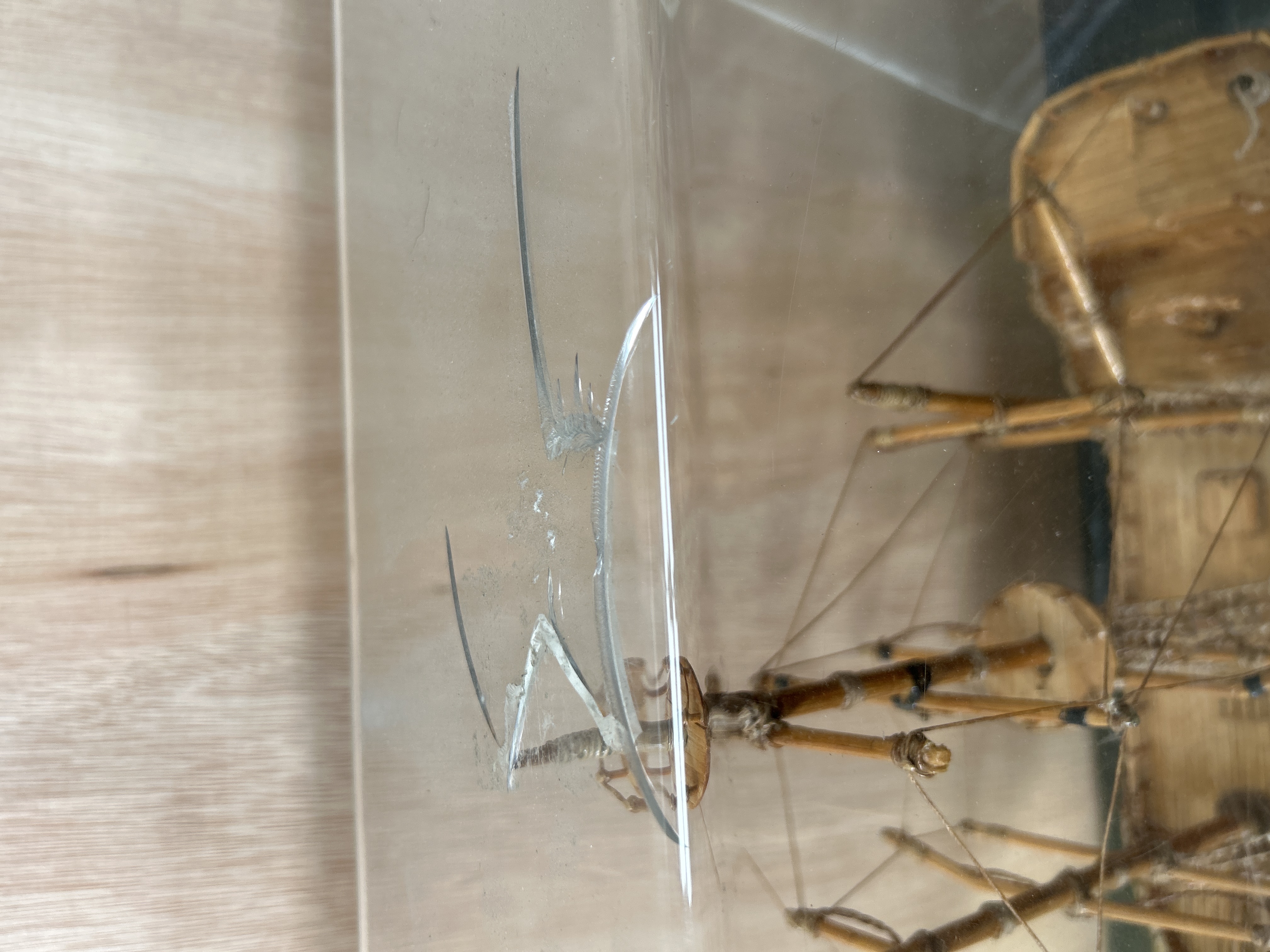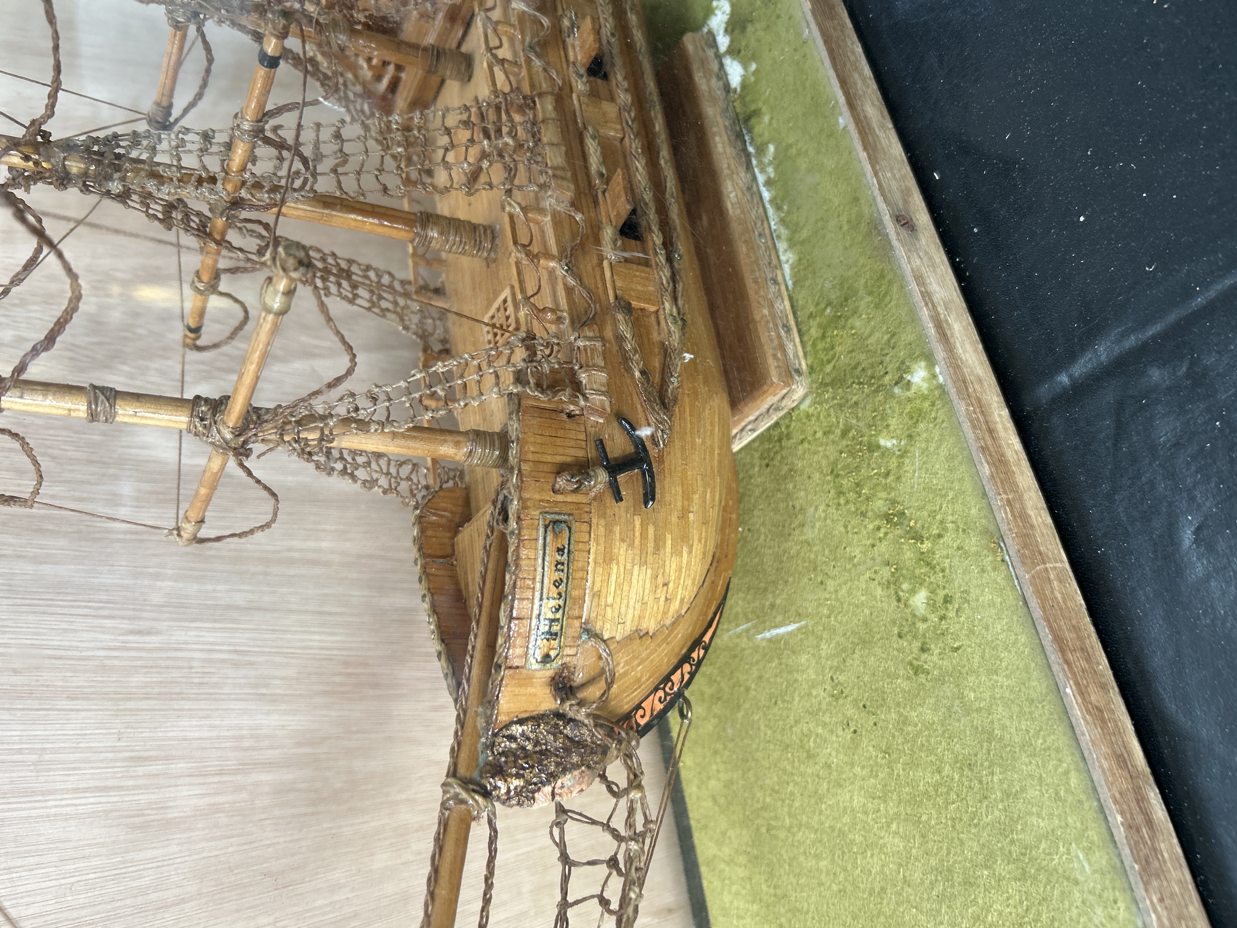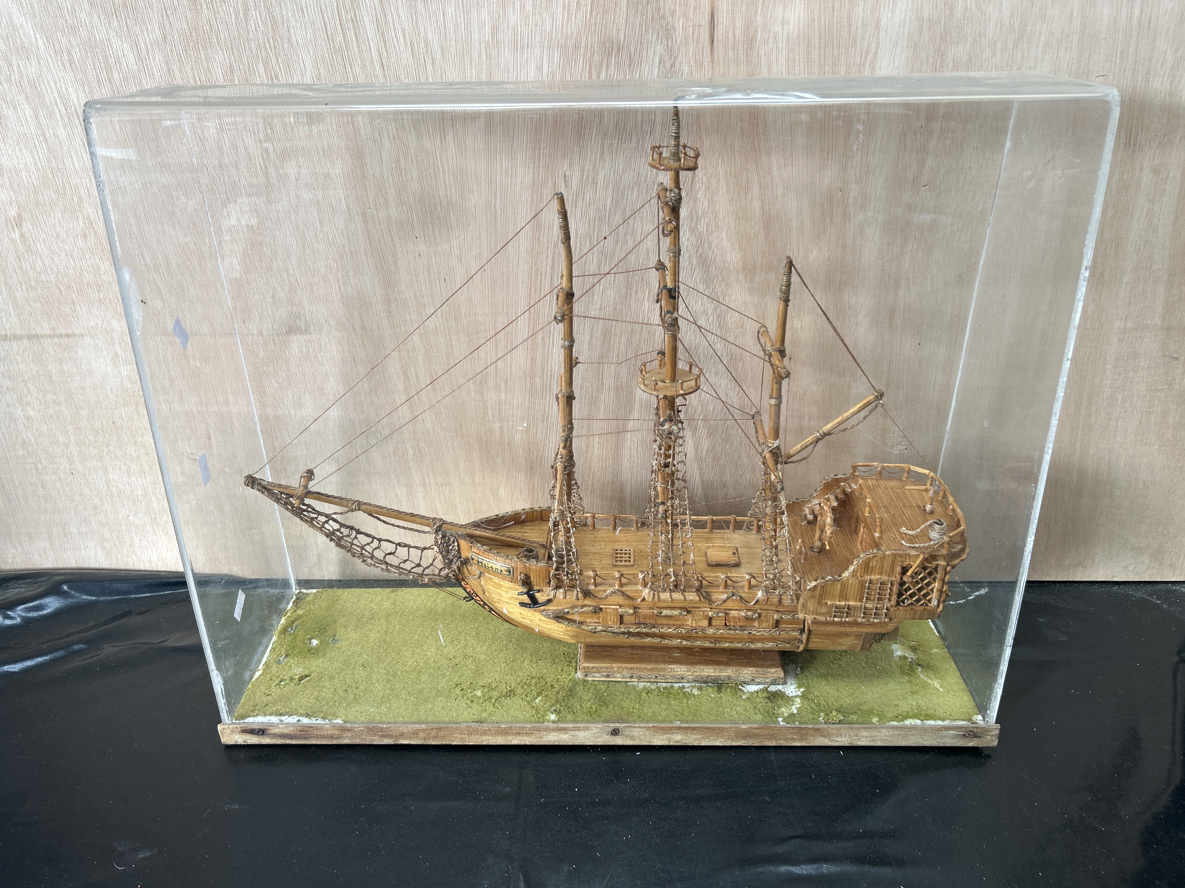 A folk art model of a three-masted sailing ship, constructed from small wooden strips and matchsticks in the style of a 17th-century galleon. The vessel features a detailed hull, masts with associated rigging, a bowsprit with netting, and a small black anchor. A nameplate on the port bow bears the name Helena in black lettering. The model is mounted within a rectangular clear acrylic display case on a wooden base with a green-flocked interior.