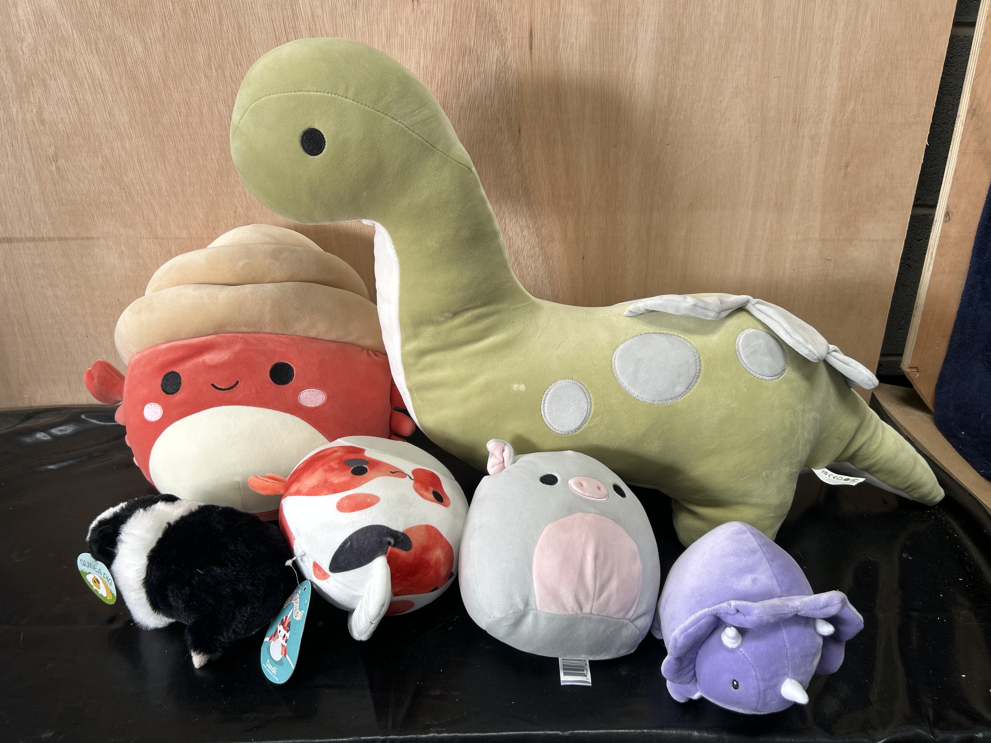 A group of six assorted plush toys, including several examples designed in the style of Squishmallows by Kellytoy. The collection features a large long-necked dinosaur in light green with grey circular spots, a white underbelly, and small white wings or fins, which includes a white fabric manufacturer tag near the tail. Also present is a red hermit crab plush with a beige spiral shell and a koi fish plush with a white, red, and black patterned body. The koi fish retains a blue cardboard hang tag with the text Dandii. The group further includes a round grey plush with a pink snout and inner ears featuring a fabric barcode tag, a small purple triceratops with three white horns and a ruffled crest, and a small textured black and white guinea pig plush with a green cardboard hang tag marked GUINEA PIG. All items are constructed from soft-touch synthetic plush fabric with polyester stuffing.