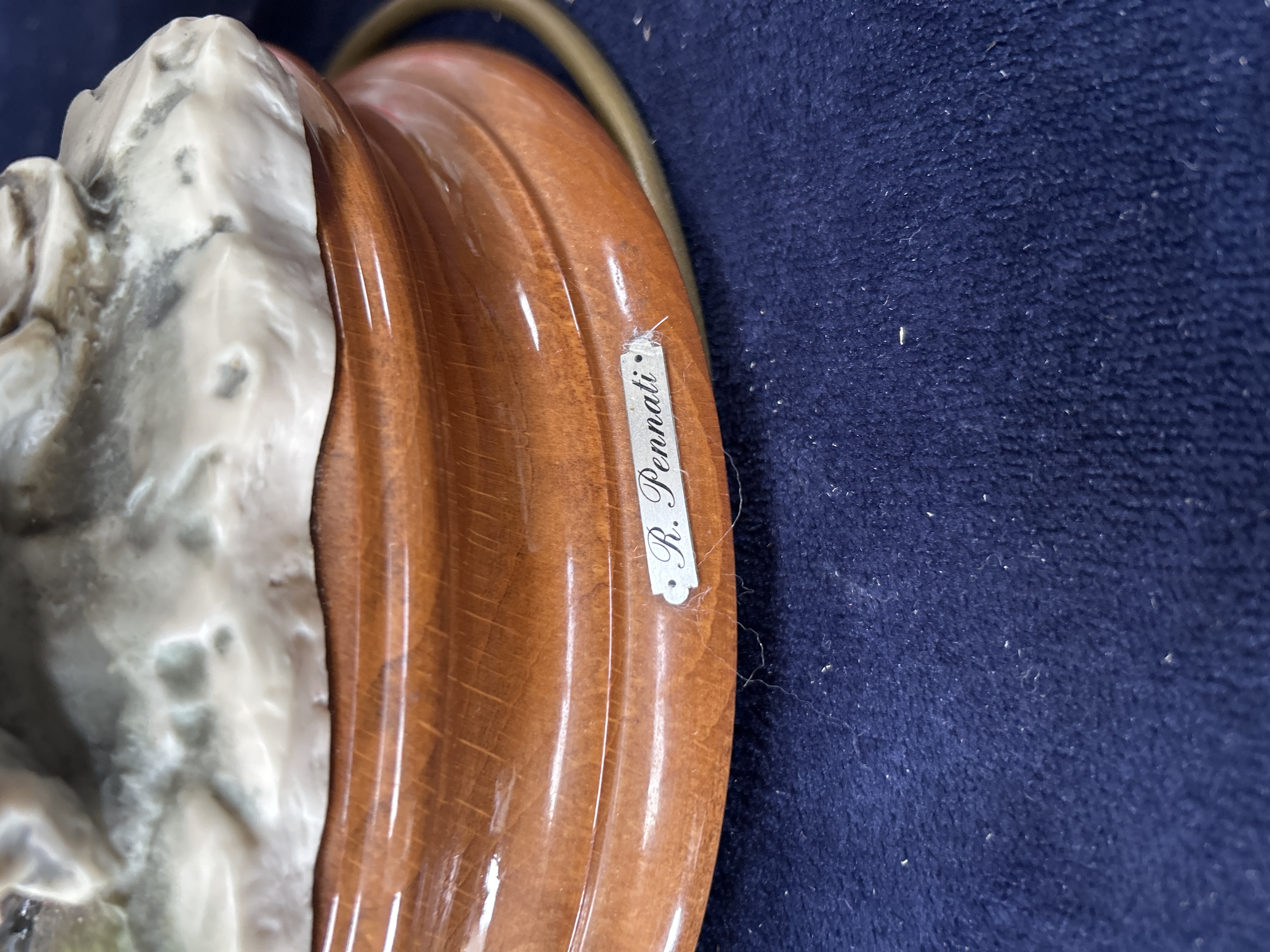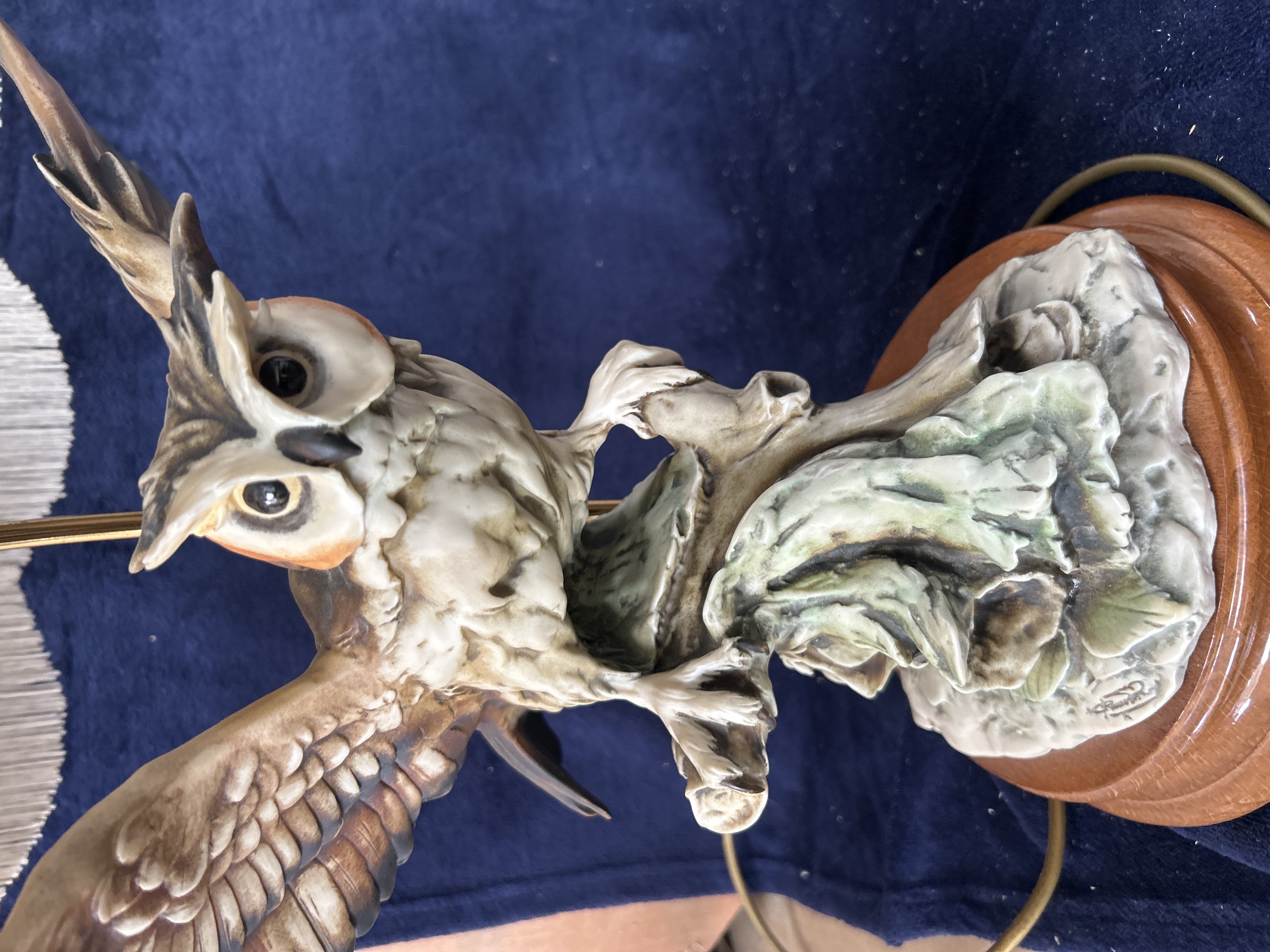A vintage Italian table lamp featuring a hand-painted porcelain sculpture by the artist R. Pennati. The central figure depicts an owl in flight with outstretched wings, realistically modelled and perched upon a rocky-style ceramic base. The sculpture is mounted on a circular, turned, and polished wooden plinth. The wooden base is fitted with a small rectangular metal plaque inscribed R. Pennati, and the ceramic base features a corresponding incised signature. The lamp is supported by a brass-toned metal stem and is topped with a large, cream-coloured fabric shade of flared, hexagonal form, decorated with scrolling braid trim and a deep fringe. The item is fitted with a gold-coloured three-core electrical flex. This item is sold as an electrical collectible and has not been PAT tested; inspection by a qualified electrician is recommended before use.
