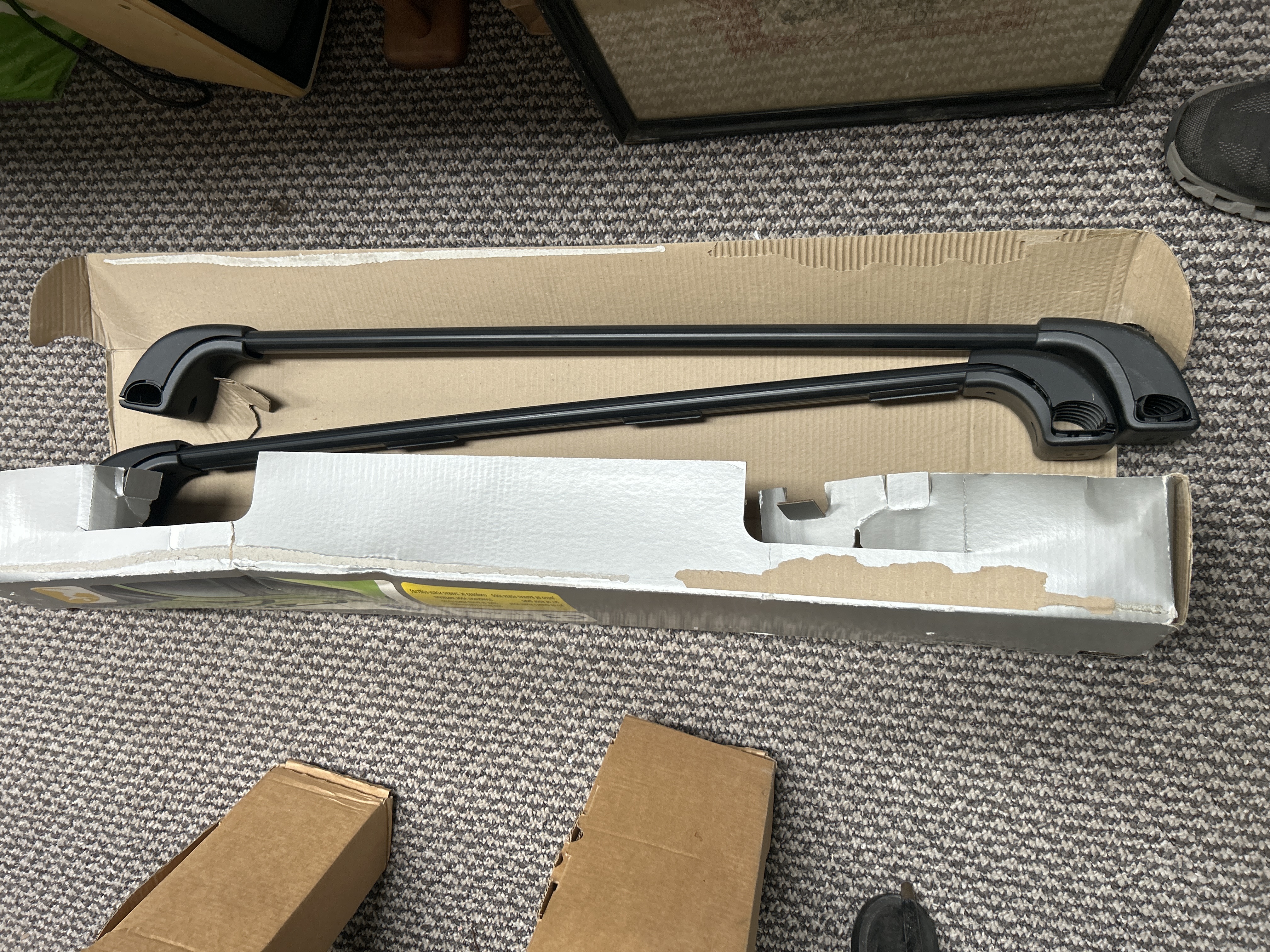A set of two automotive roof bars specifically designed for the Citroen C3 Picasso, suitable for models produced approximately between 2008 and 2017. The bars are constructed from black finished metal with integrated mounting feet and plastic end caps. The original cardboard packaging is included, which features the printed text C3 PICASSO and a multi-language descriptive label identifying the contents as a Set of Roof Bars (Jeu de Barres Porte-Tout / Satz Dachtragerstangen). The packaging also displays a blue star-shaped City Crash Test certification logo. These items are identified as official manufacturer accessories based on the specific model branding and packaging style.