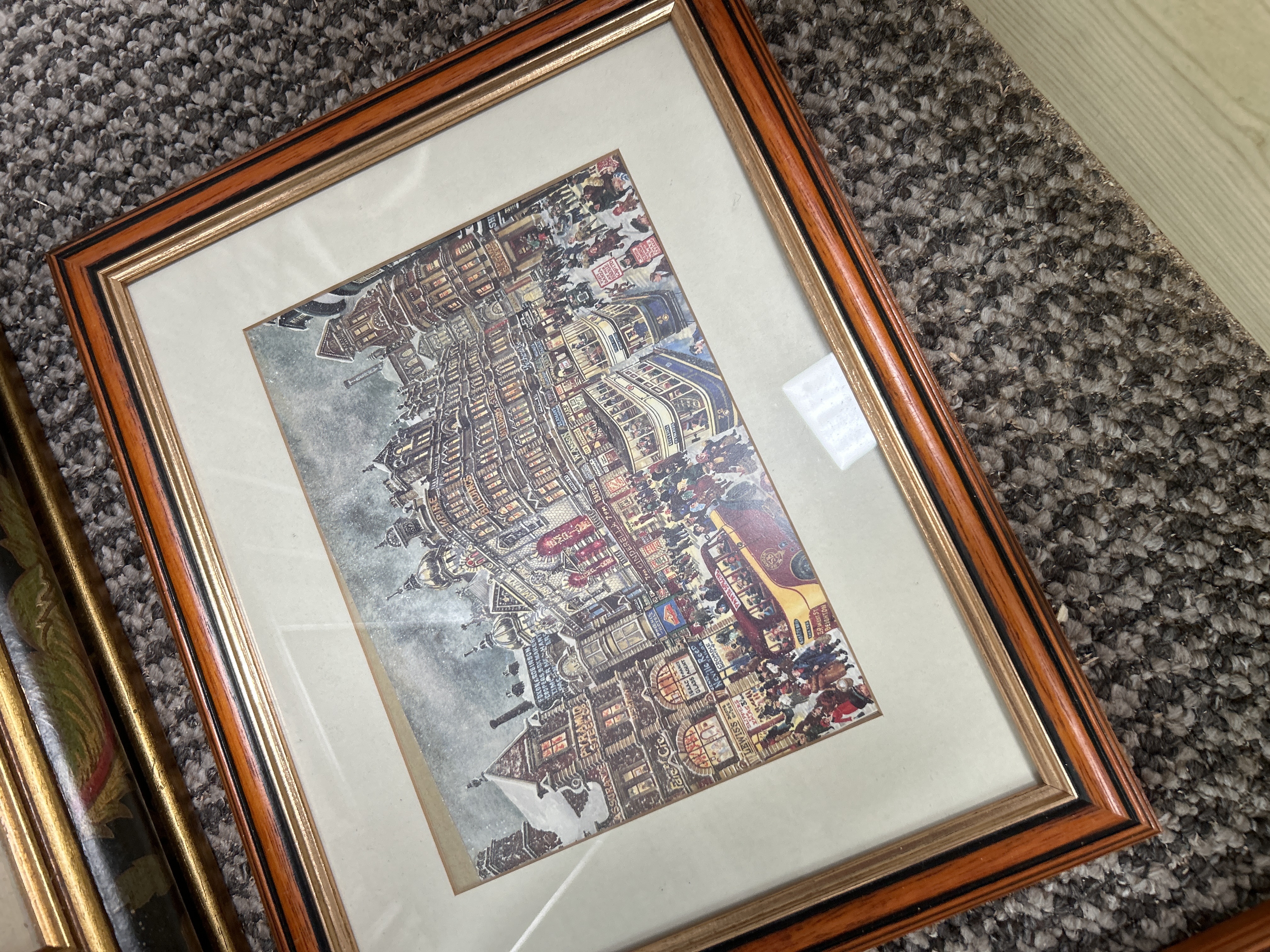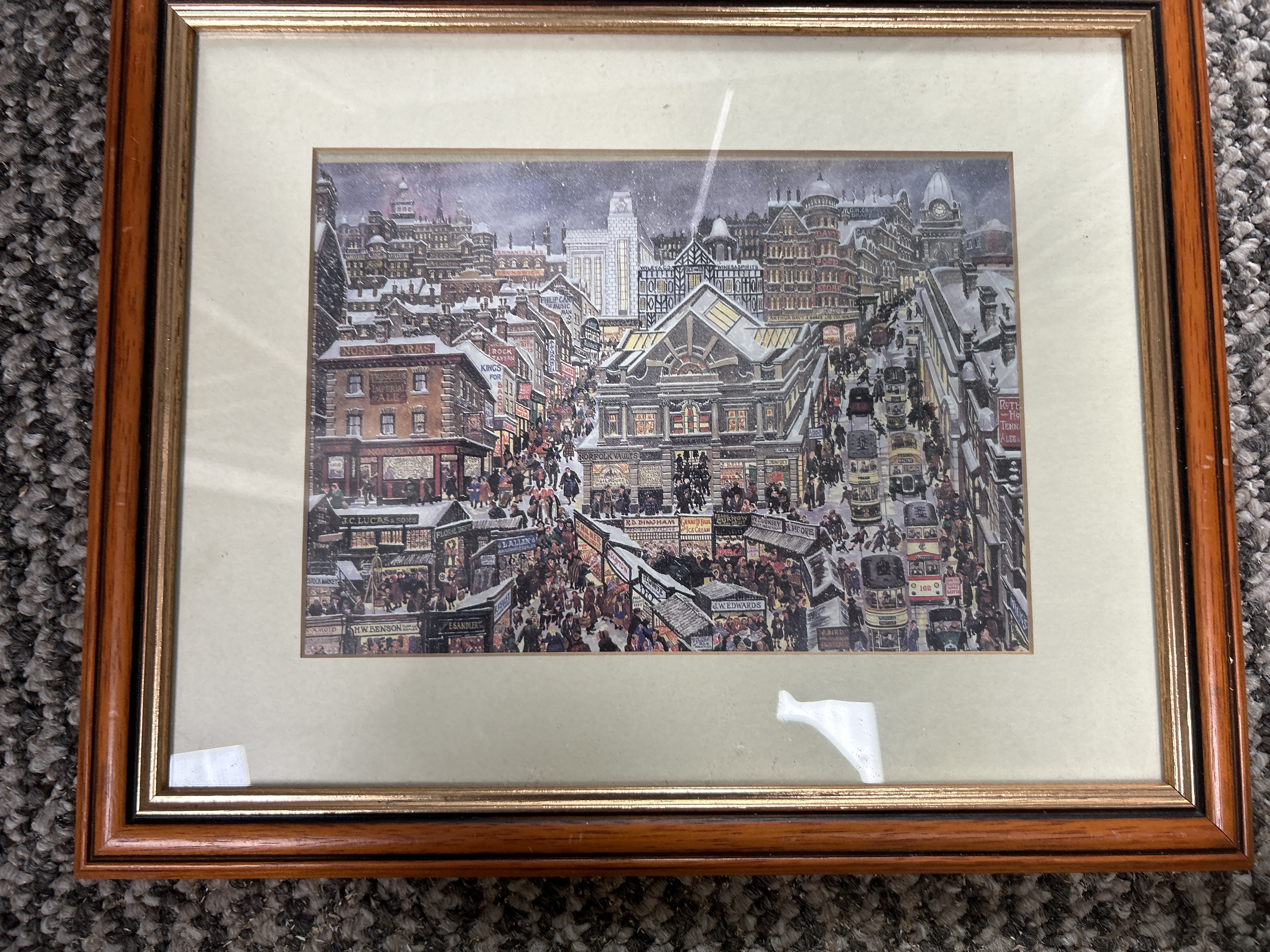 An assortment of decorative items comprising a rectangular wall mirror and several framed prints. The mirror is housed in an ornate white-painted frame featuring scrolling foliate corner embellishments. The collection includes a large portrait print depicting a woman in Victorian or Edwardian attire, wearing a wide-brimmed hat and apron, presented in a wide frame with a red, green, and black foliate design. Also included are several prints on paper depicting bustling, snowy urban street scenes with vintage trams and detailed storefronts. Signage within these scenes includes Norfolk Arms, The Empire, and J.C. Lucas and Sons. These cityscape prints, which are attributed to Bob Holloway based on style and subject matter, are set in matching wood-effect frames with gilt-lined inner edges and cream mounts.