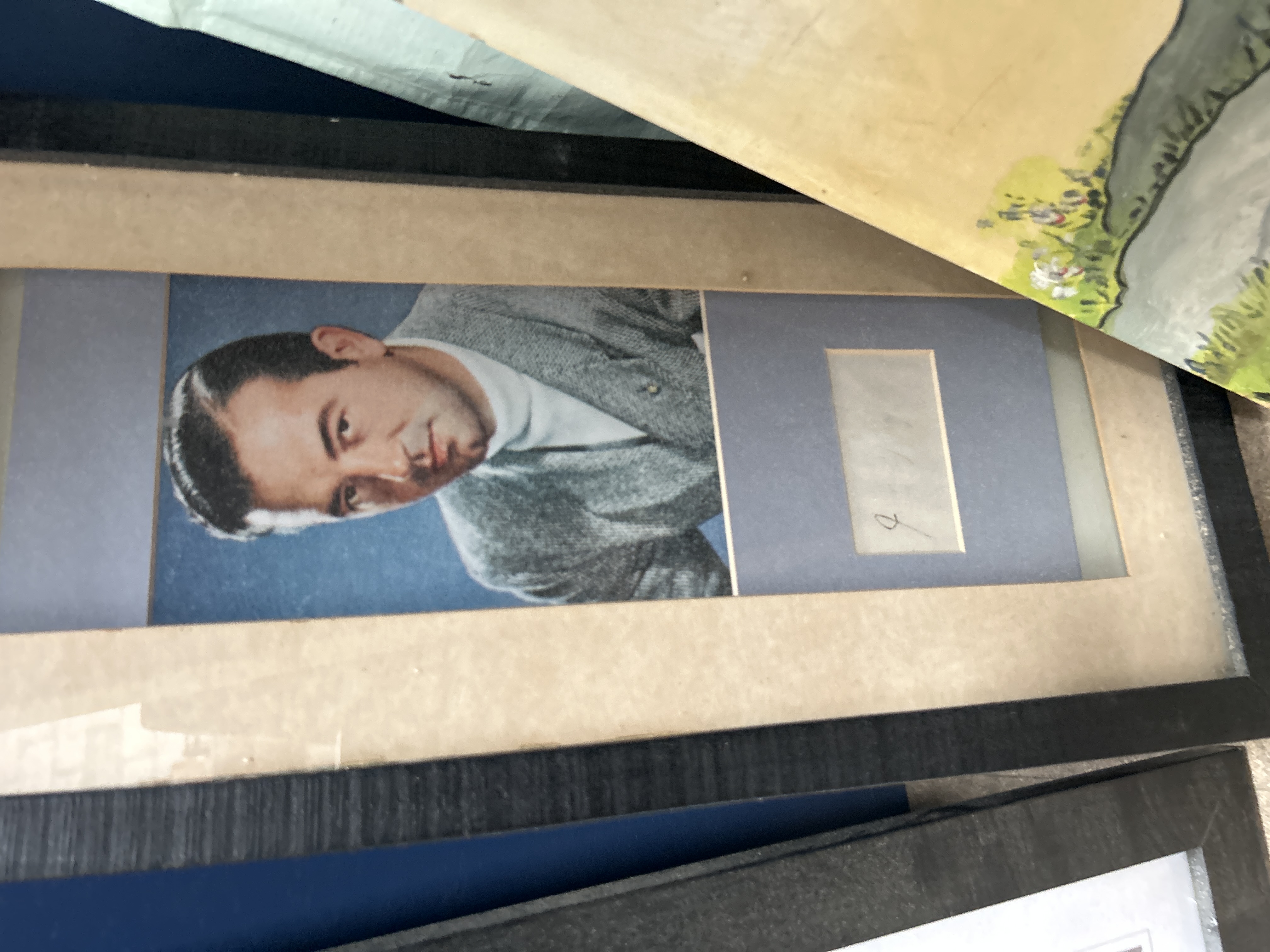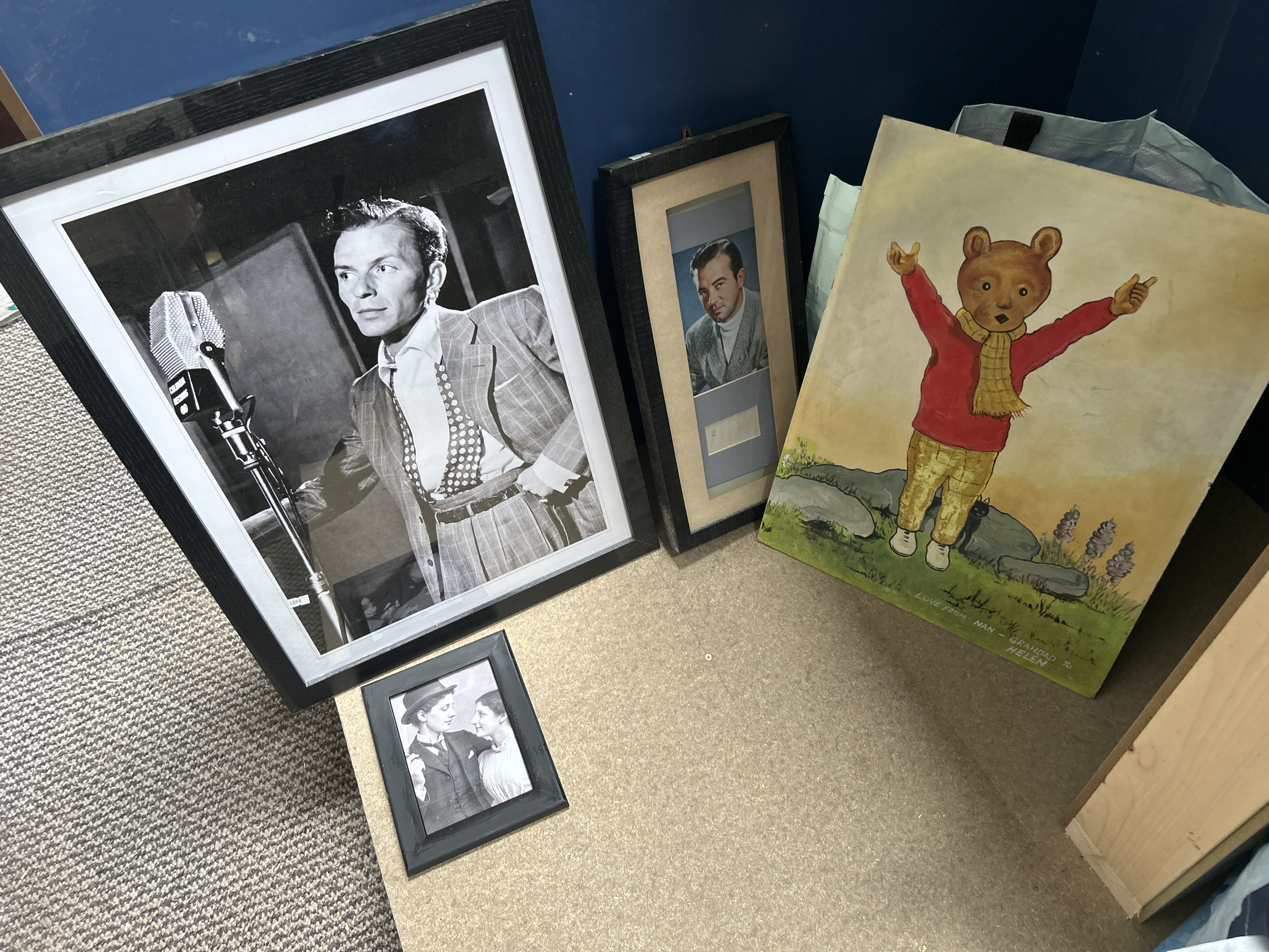 A group of artworks comprising photographic prints and a painting on board. The collection includes a large framed black and white photographic print depicting Frank Sinatra standing before a Columbia Records microphone. Also present is a framed colour photographic portrait of a man in a grey jacket and white roll neck, featuring a separate mount window containing an illegible signature. A smaller framed black and white photograph depicts a couple in vintage dress. Completing the group is an unframed painting on board depicting the character Rupert Bear in a red jumper and yellow scarf, executed in the manner of Alfred Bestall. This piece features a handwritten inscription along the lower edge reading LOVE FROM NAN – GRANDAD TO HELEN. The framed items are presented in simple dark-stained frames with card mounts.