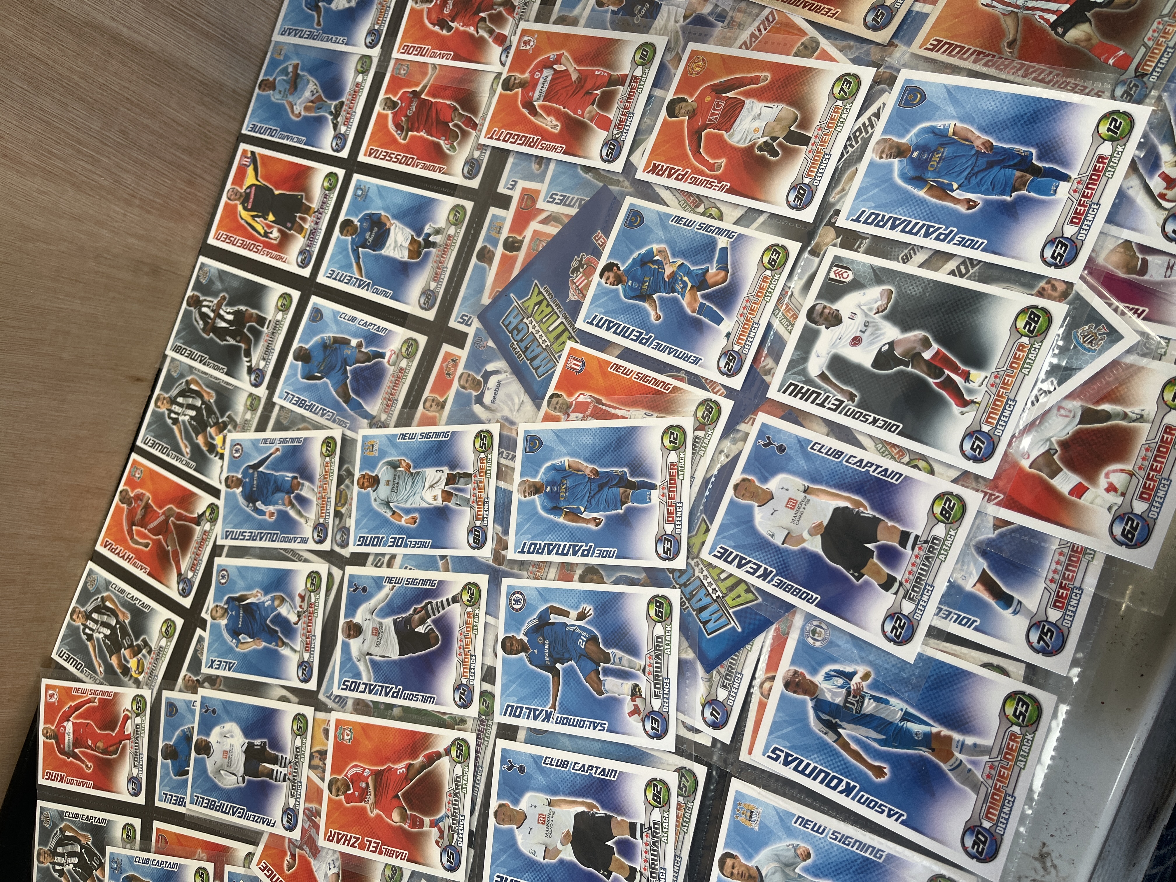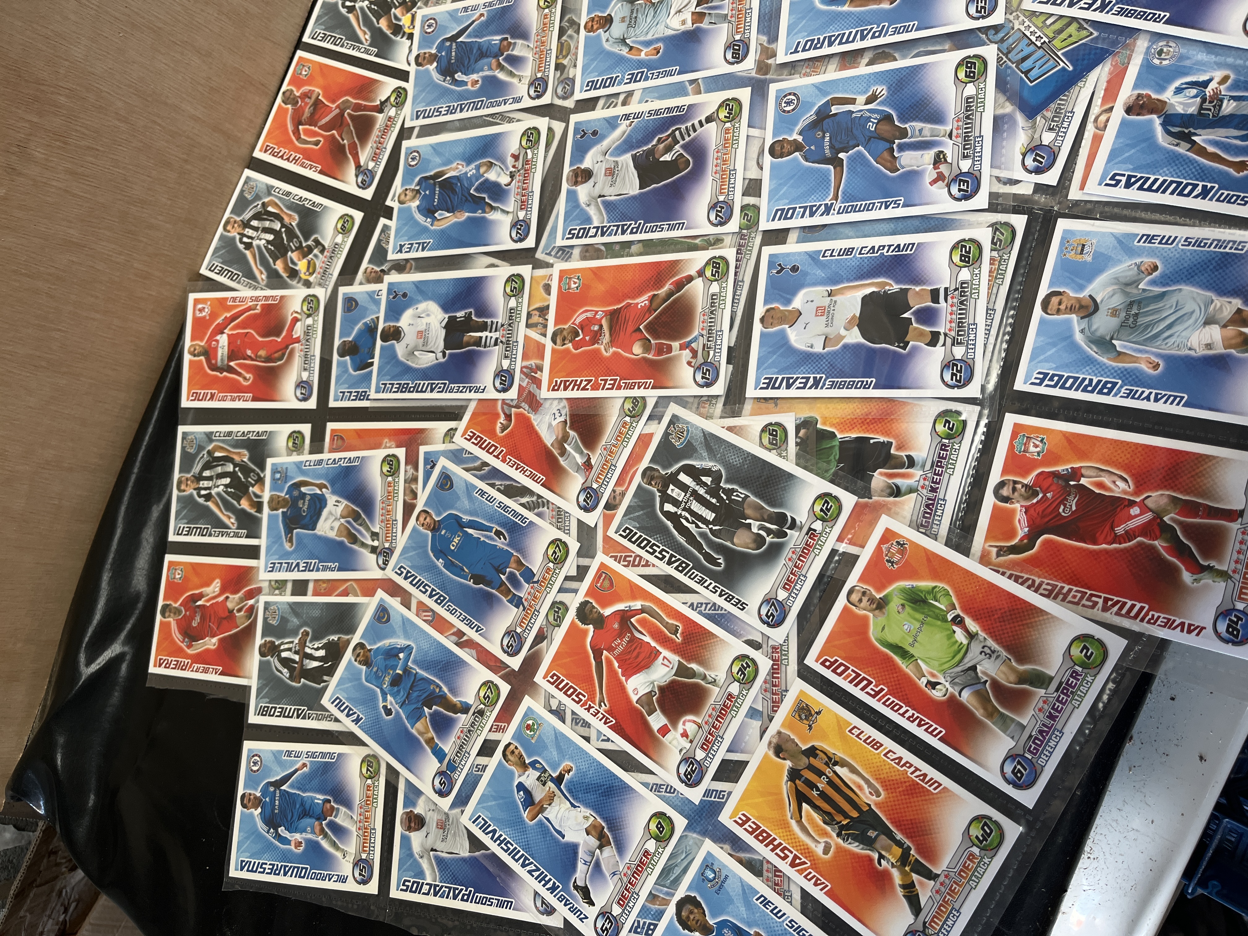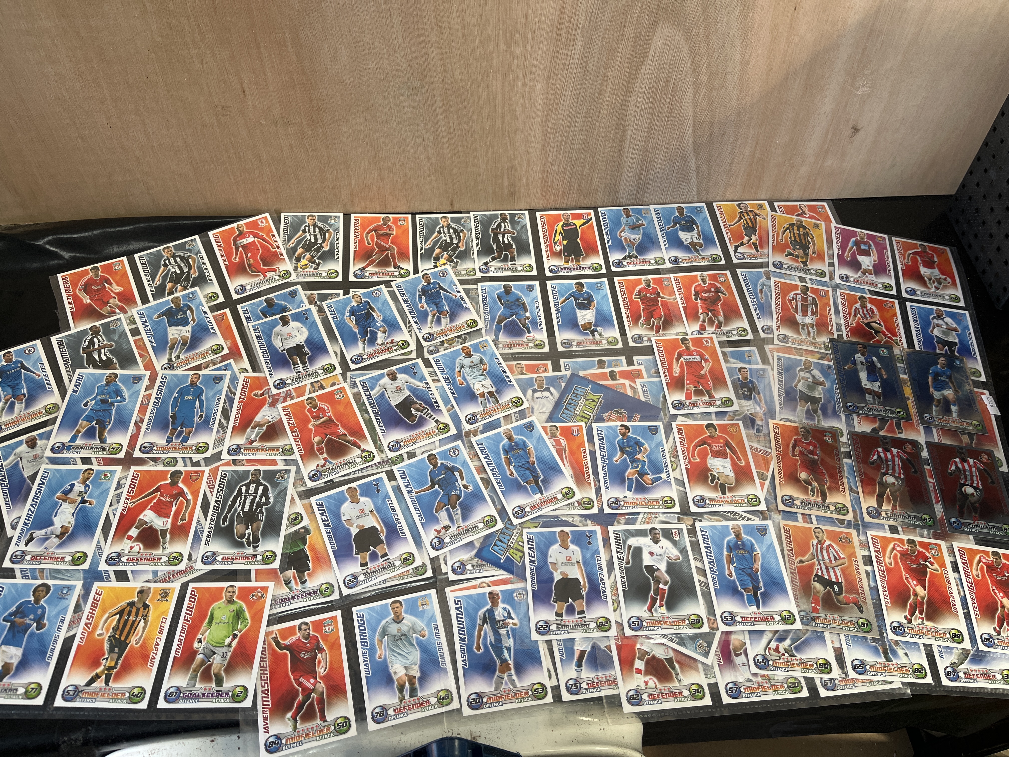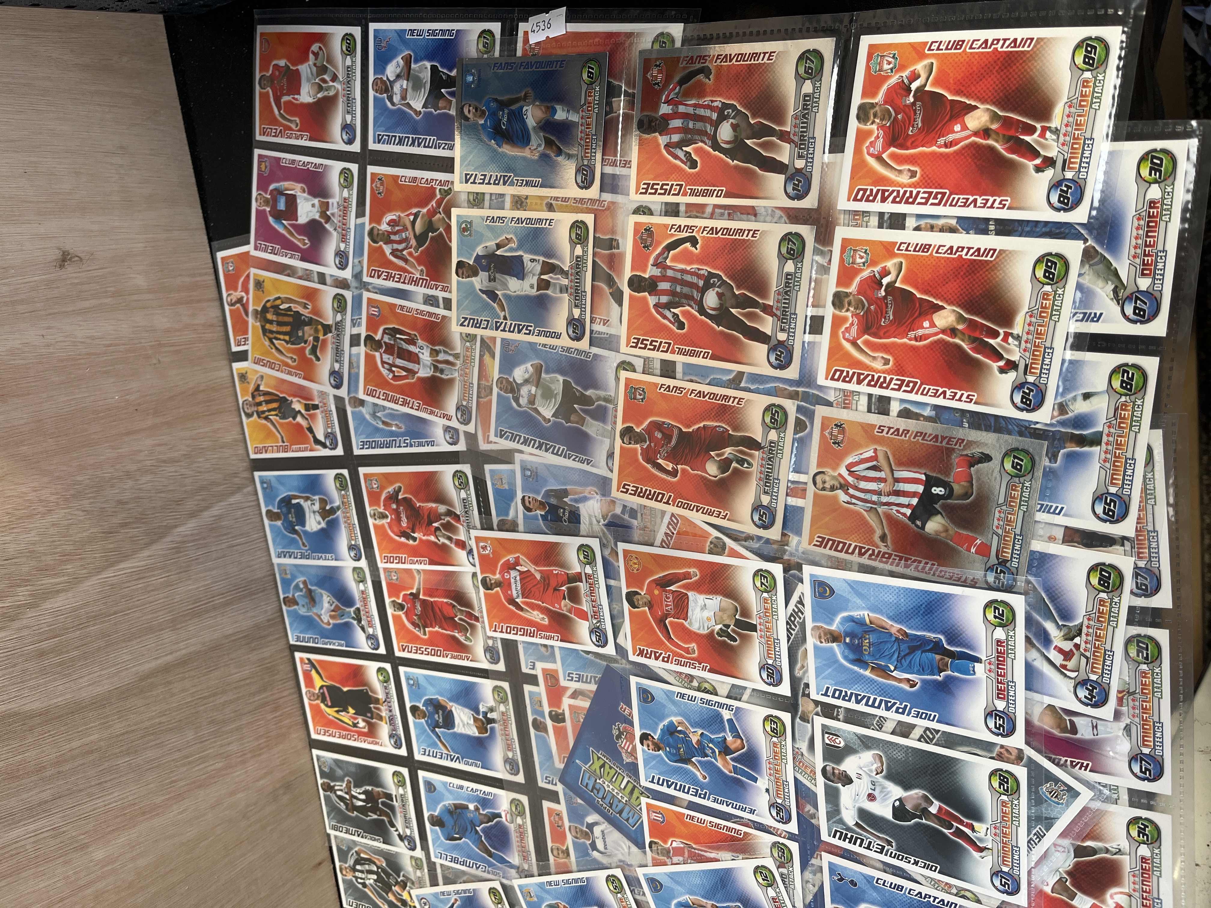 A substantial collection of Topps Match Attax trading cards from the 2008-2009 English Premier League season. The lot includes a wide variety of base cards and several special subsets. The cards feature graphic designs with player action shots against club-coloured backgrounds, including defense and attack statistics. Notable subsets present include Club Captains, Fans Favourite, Star Players, and New Signings. Key players identified within the collection include Steven Gerrard (Liverpool), Robbie Keane (Tottenham Hotspur), Michael Owen (Newcastle United), Fernando Torres (Liverpool), Mikel Arteta (Everton), Djibril Cissé (Sunderland), and Park Ji-Sung (Manchester United). Other clubs represented include Chelsea, Arsenal, Hull City, Portsmouth, and Middlesbrough. The cards are presented within multi-pocket plastic binder sheets.