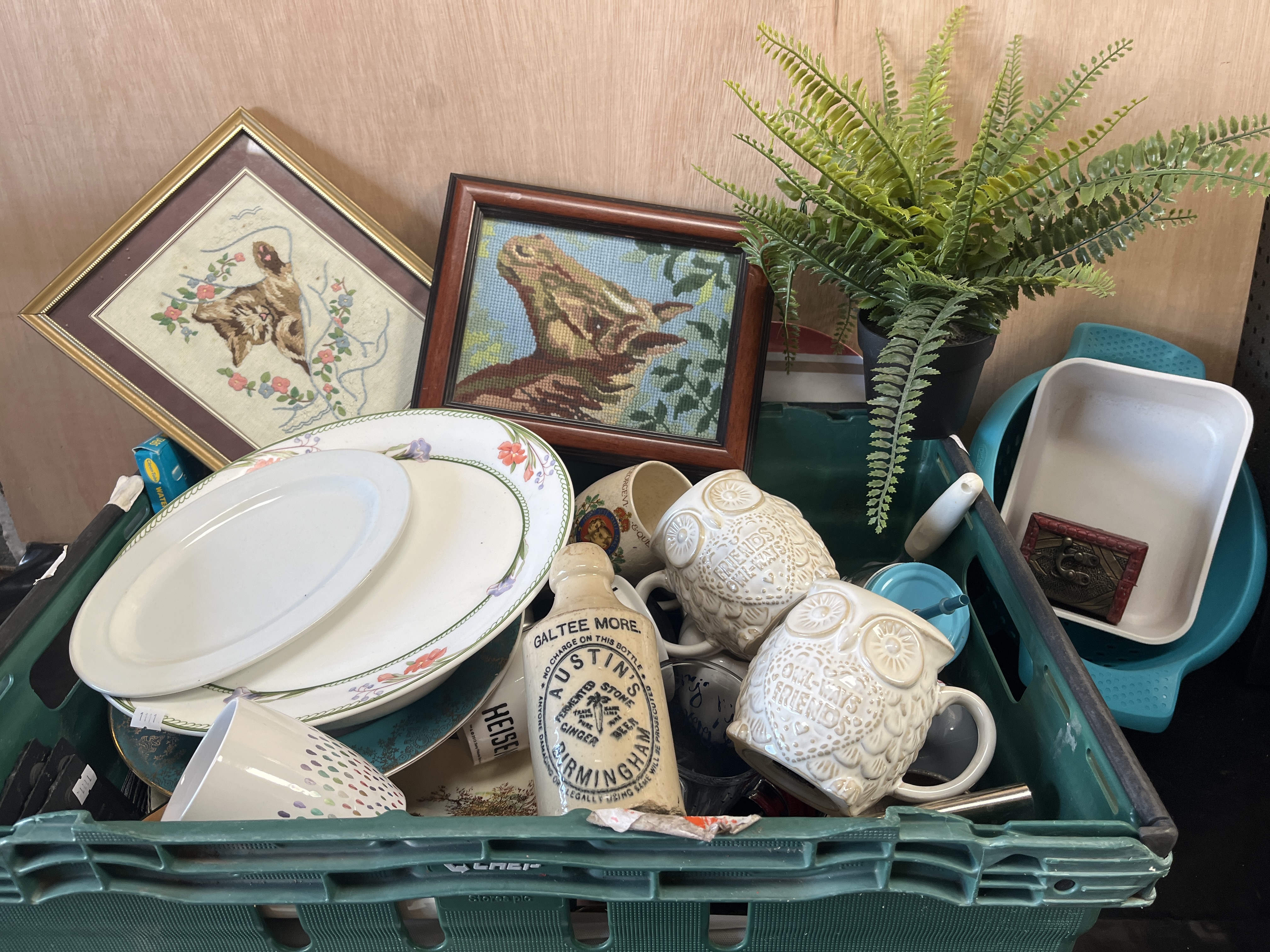 A collection of various ceramics, decorative arts, and household items contained within a green plastic crate. The group includes several glazed ceramic plates with printed floral and patterned borders, and various mugs including a pair with relief-moulded owl designs and text reading Friends Owl-ways and Owl-ways Friends. The lot features a salt-glazed stoneware bottle with a black transfer-printed label transcribed as Galtee More, Austin’s, Fermented Stone Ginger Beer, and Birmingham. Also included are two framed textile pictures depicting a kitten and a horse’s head, a white rectangular ceramic baking dish, a teal plastic basin, a small ornamental box, and an artificial fern in a black plastic pot.