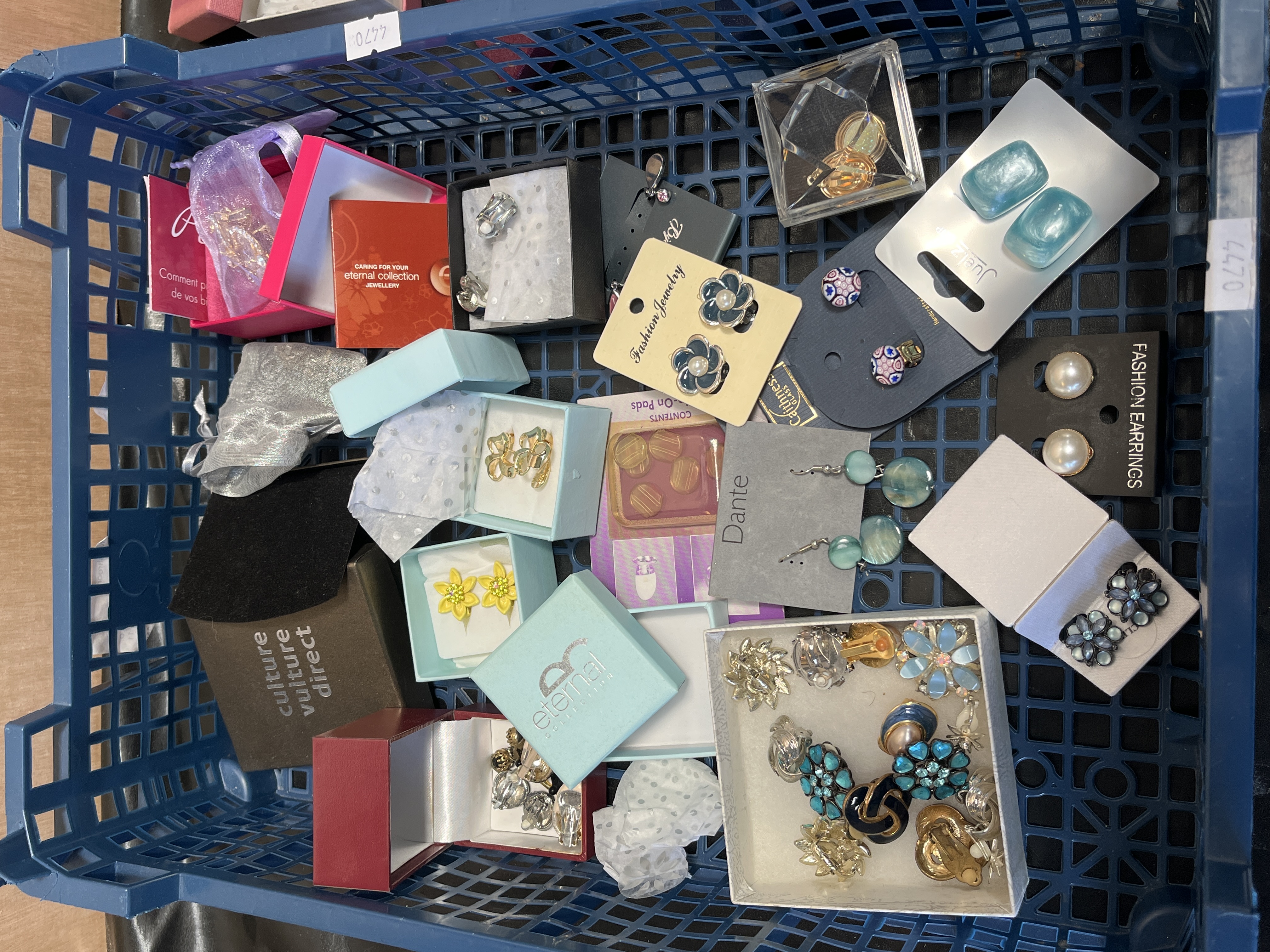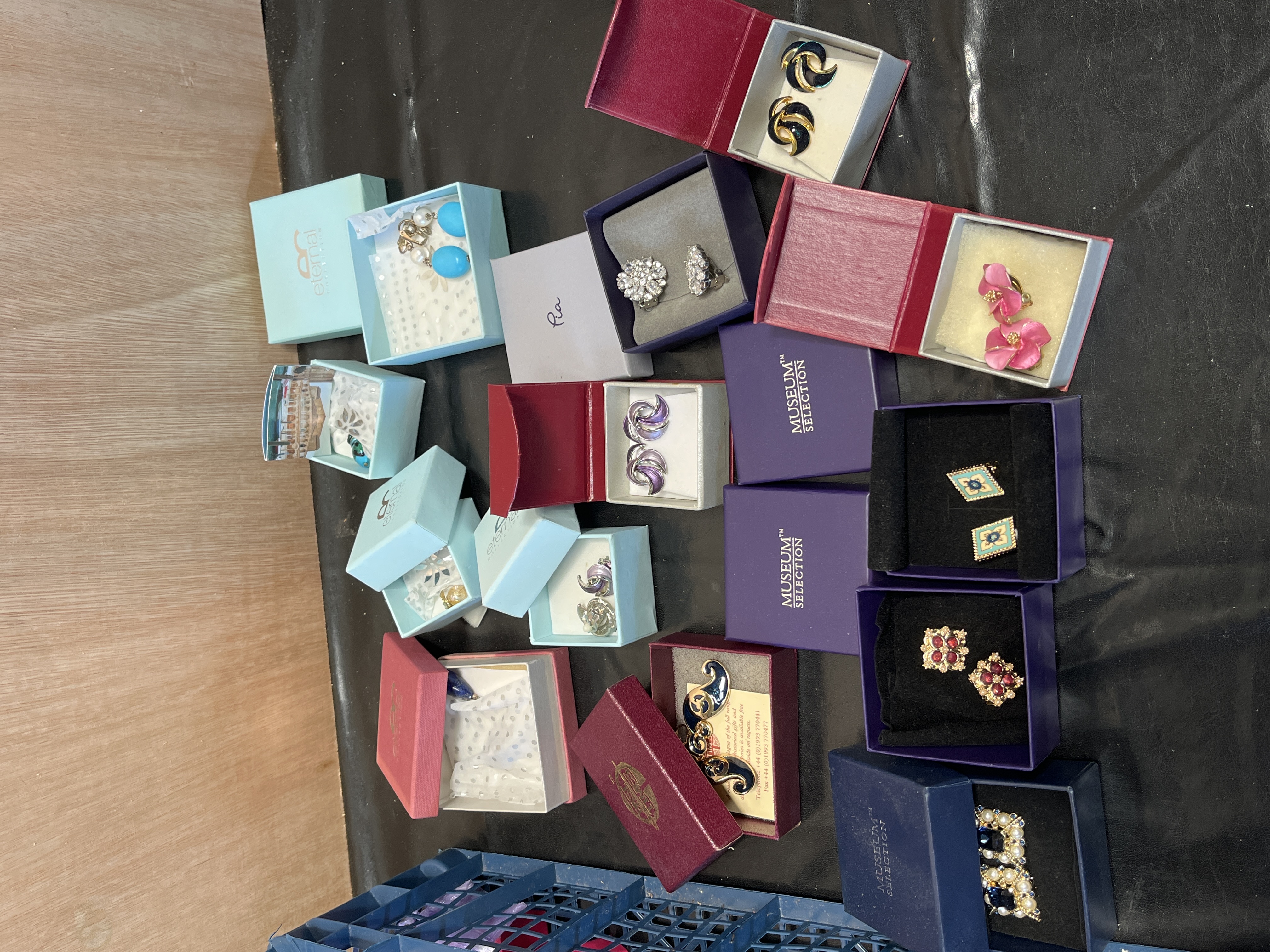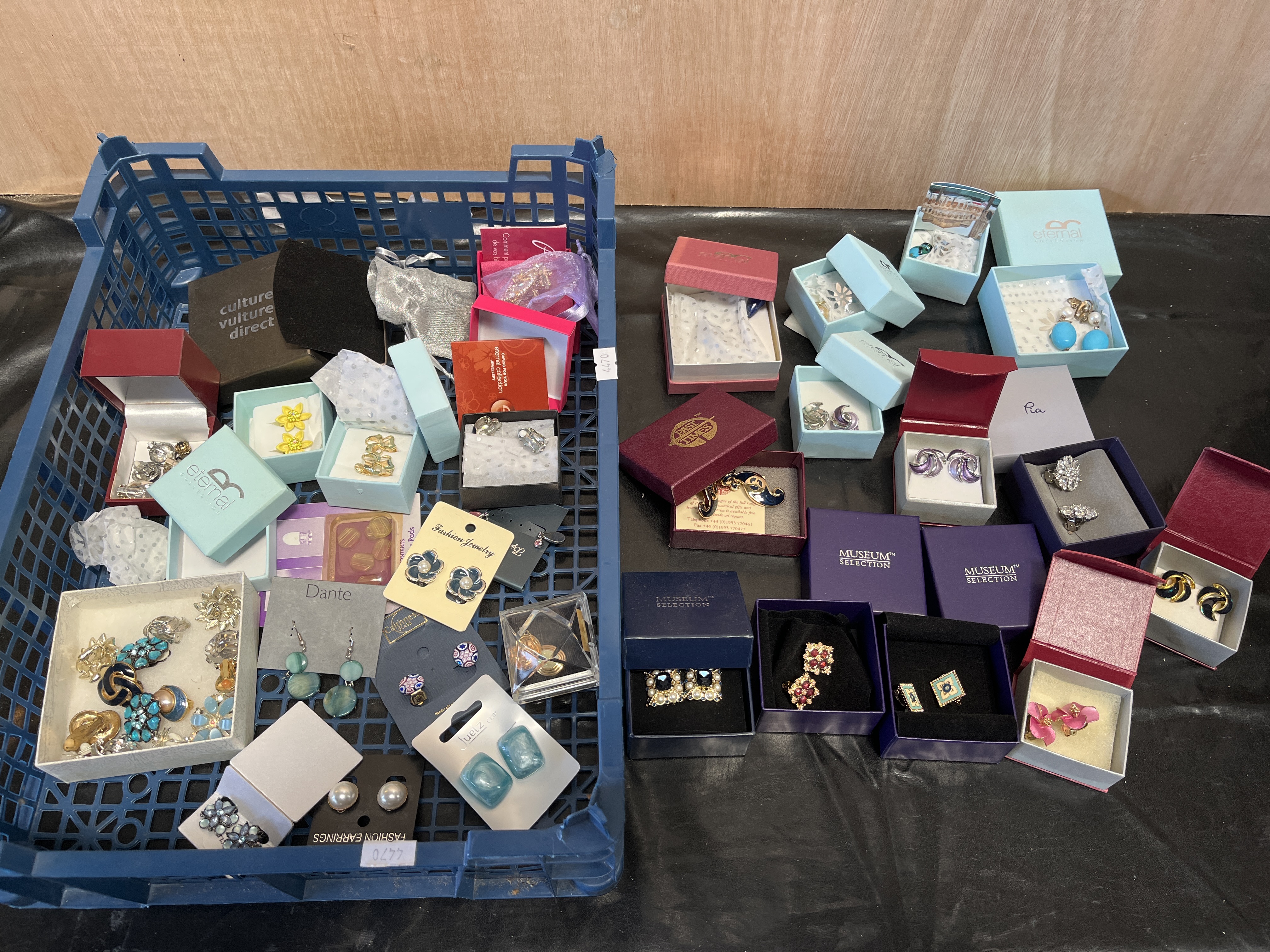 An assortment of contemporary costume jewellery, primarily consisting of earrings, featuring pieces from or retailed by Museum Selection, Past Times, The Eternal Collection, Pia, Culture Vulture Direct, Dante, Juelz, and Caithness Glass. The collection includes various designs such as enamel floral motifs including daffodils, millefiori glass studs, and historical revival styles. Materials comprise gold-tone and silver-tone base metals, colourful enamel work, glass beads, simulated turquoise, faux pearls, and clear and coloured rhinestones. Many items are presented in original retail boxes or on display cards, while others are loose. Specific designs include large resin fashion earrings and classical reproduction styles.