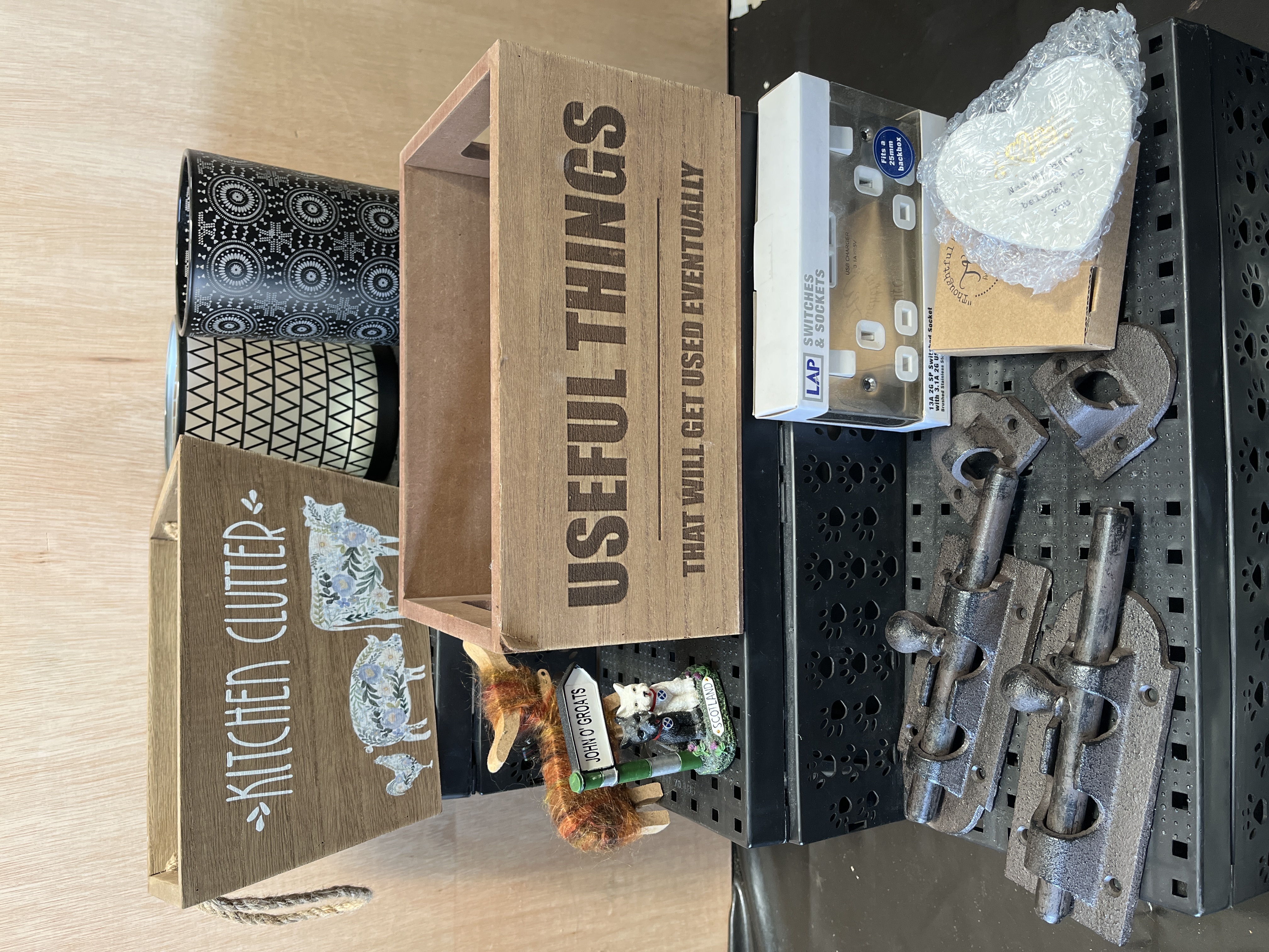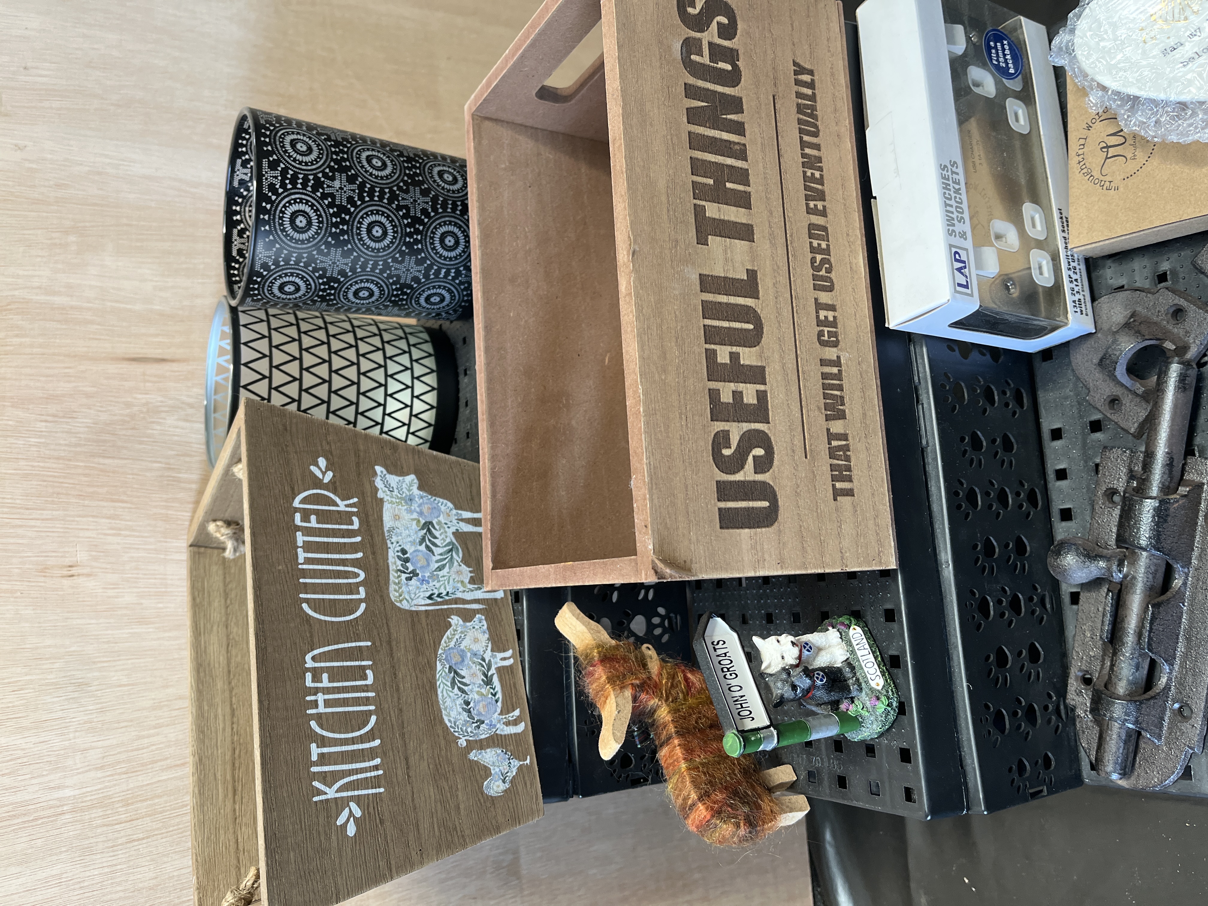 A collection of miscellaneous household items and utility goods. The lot includes two wooden storage crates: one featuring rope handles, farm animal motifs, and the text KITCHEN CLUTTER, and the other with integrated handles inscribed USEFUL THINGS THAT WILL GET USED EVENTUALLY. Also included are two cylindrical vessels featuring monochrome geometric patterns and several heavy-duty dark-finished metal barrel bolts. Electrical components comprise a boxed LAP brand 13A 2G SP switched socket in brushed stainless steel. Decorative items include a John O’ Groats souvenir ornament with West Highland Terrier figures, a multi-coloured yarn figurine, and a boxed heart-shaped plaque from the thoughtful words range.