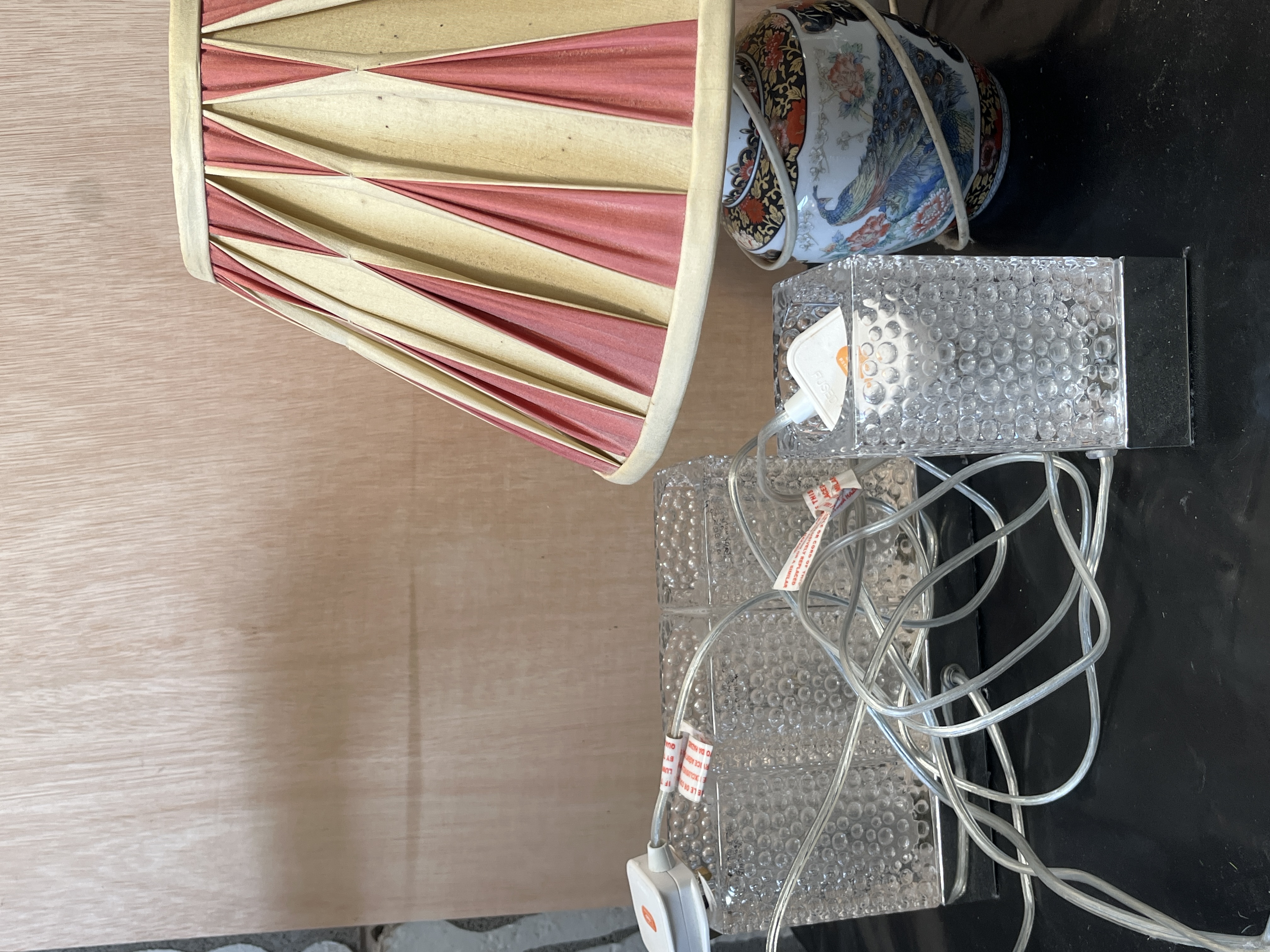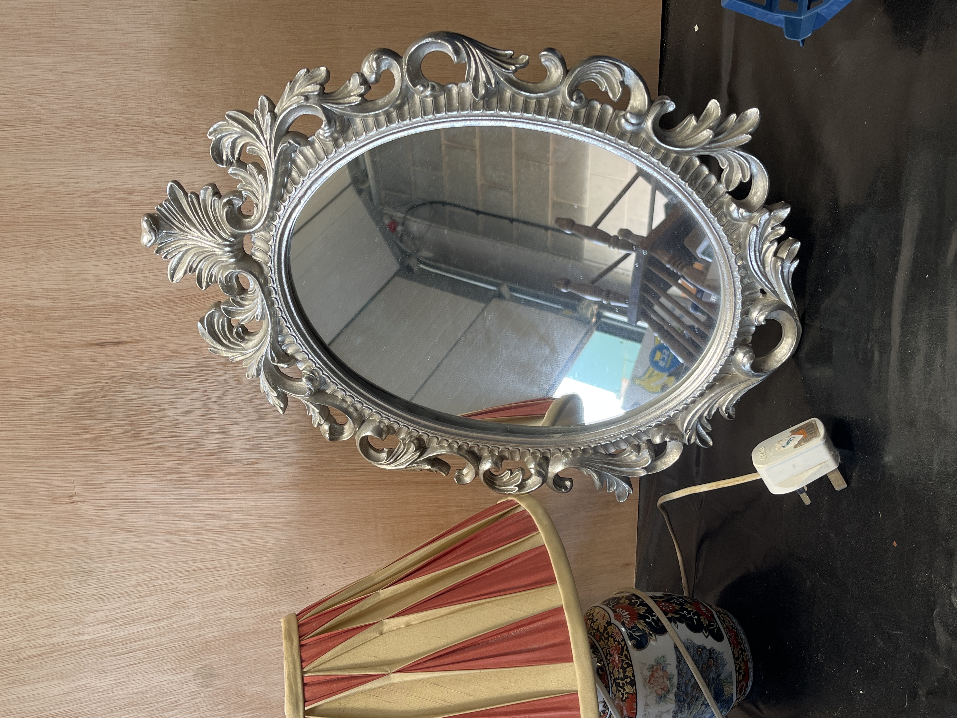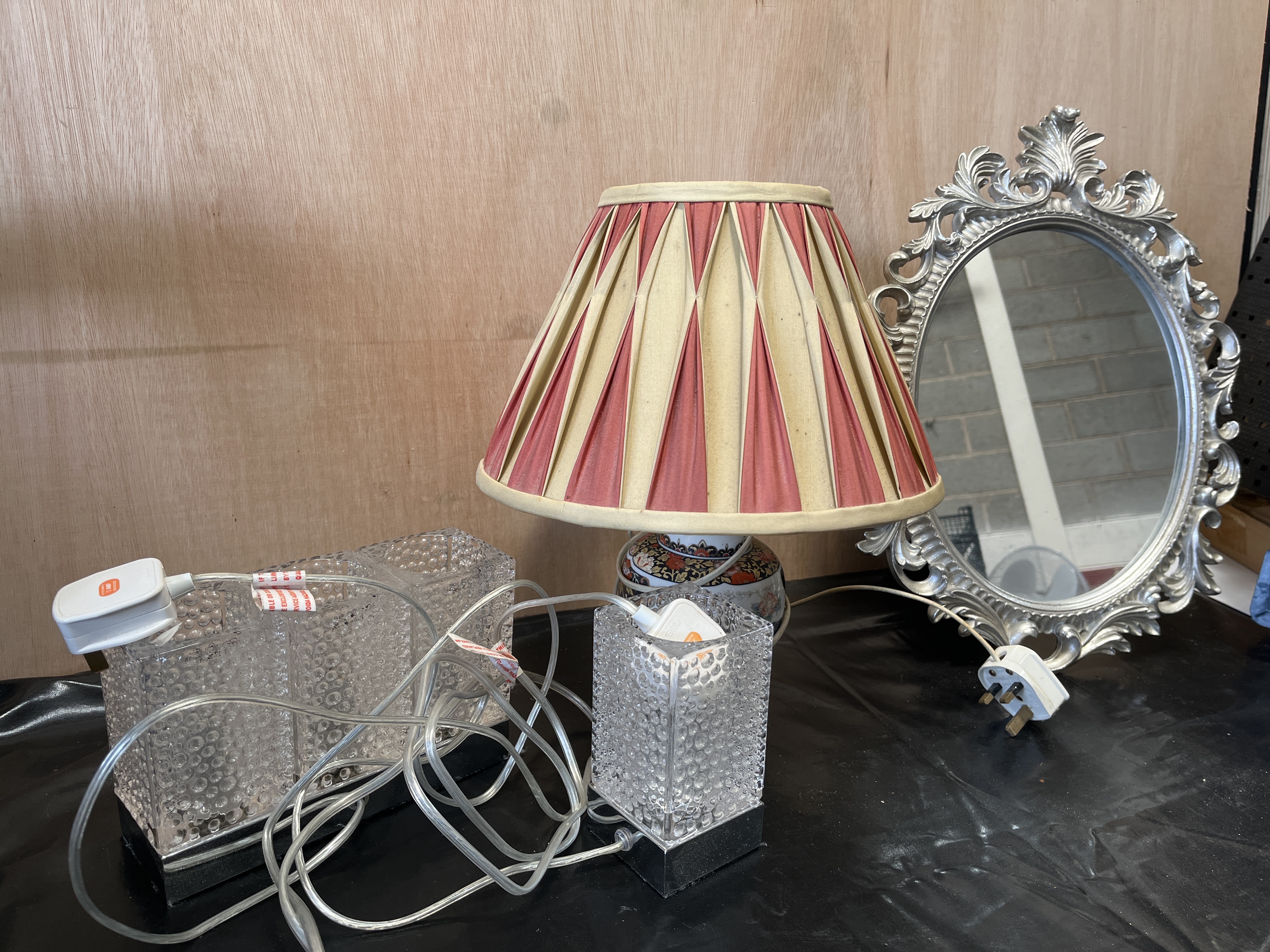 This lot comprises a collection of decorative household items including three table lamps and an ornate mirror. The first lamp features a ceramic baluster-form base with a glazed finish, decorated with a peacock and floral motifs in an Oriental style. It is topped with a pleated fabric shade featuring alternating panels of cream and dull red. Also included is a pair of modern table lamps, each featuring a rectangular clear body with an internal hobnail or bubble texture, mounted on a square polished metal base. The collection is completed by an oval wall mirror set within a silver-coloured moulded resin frame. The frame is designed in the Rococo style with prominent C-scrolls and acanthus leaf motifs. All lamps are fitted with modern white UK three-pin plugs and the glass lamps feature clear plastic cabling.