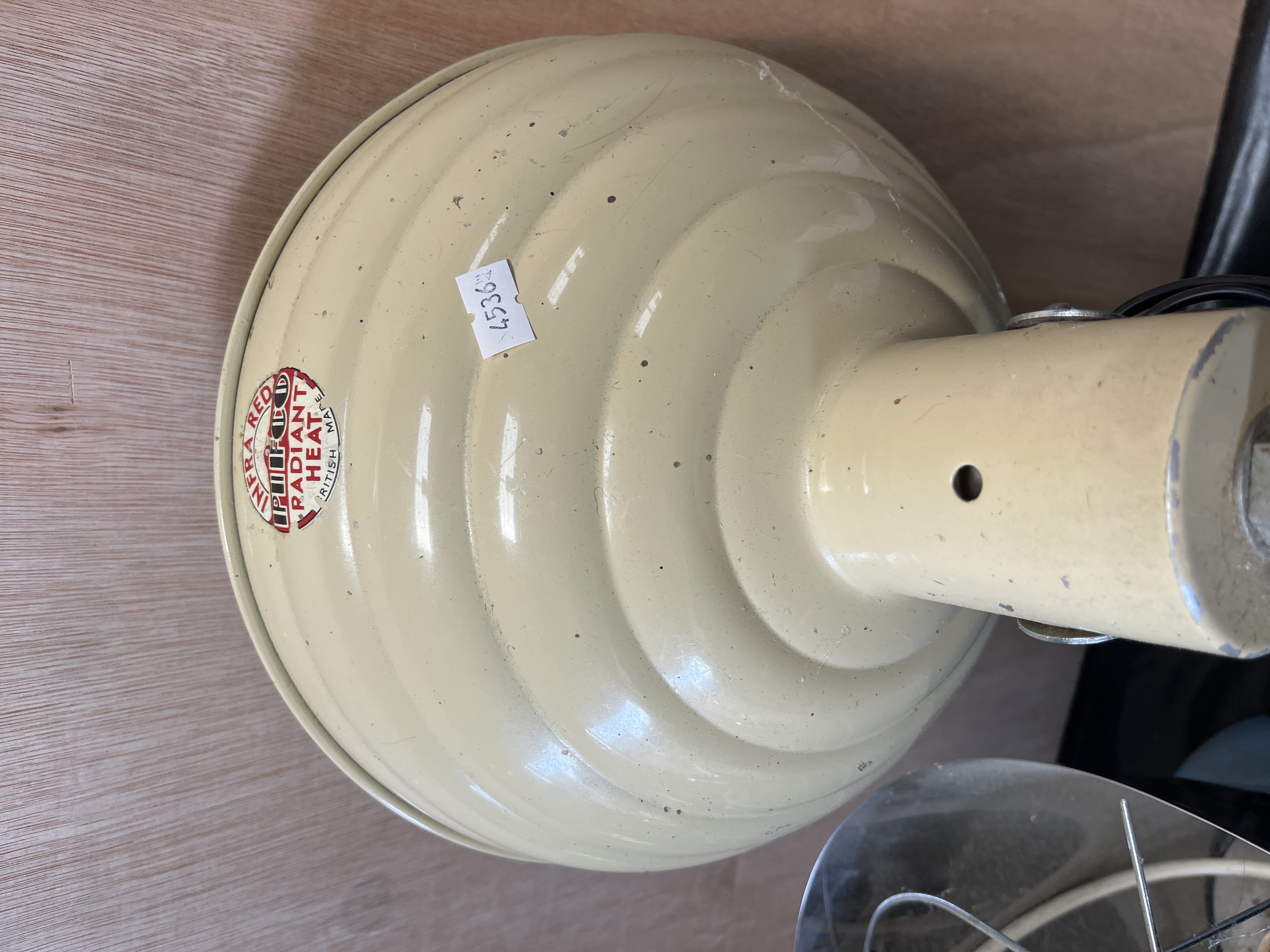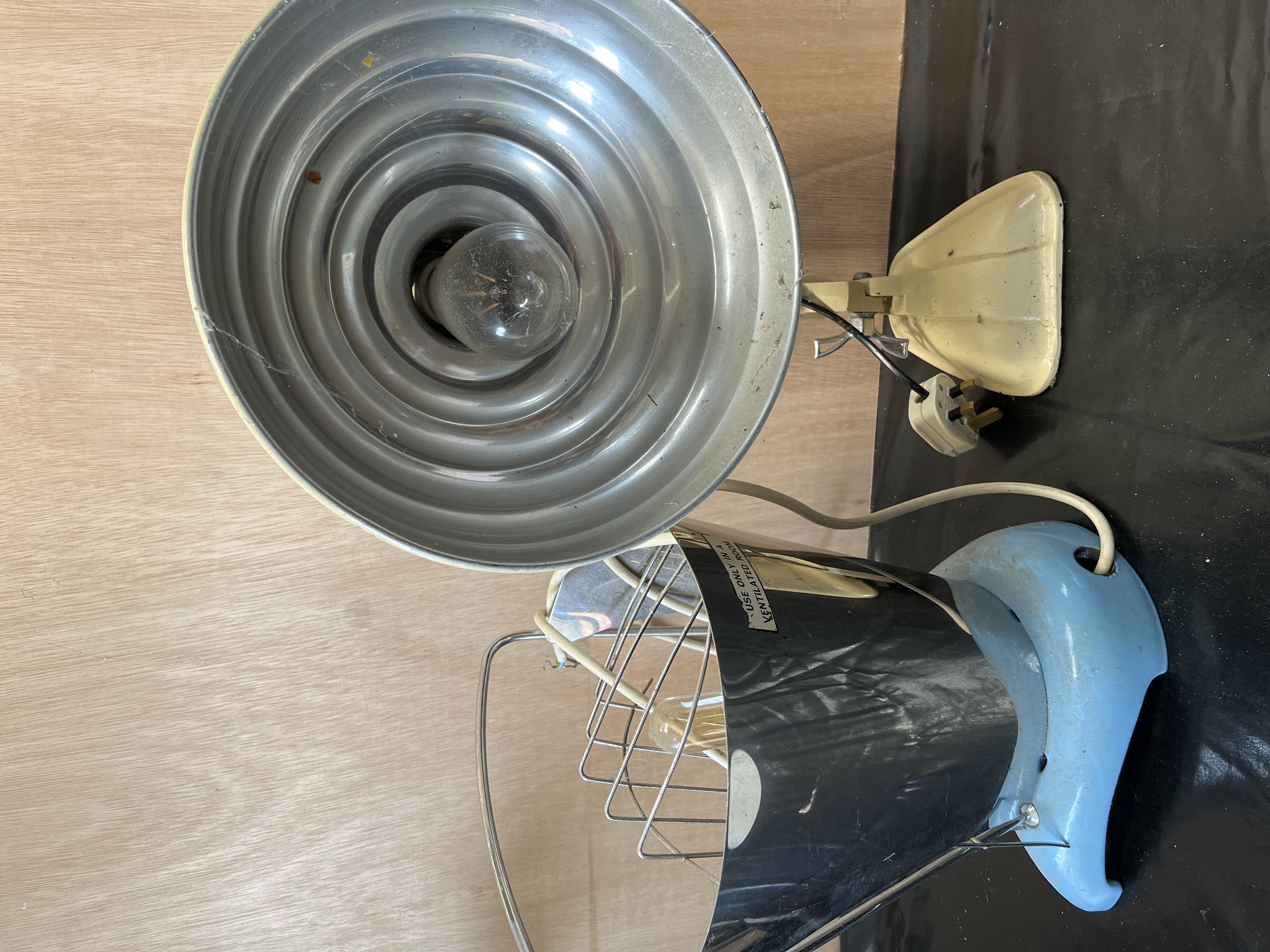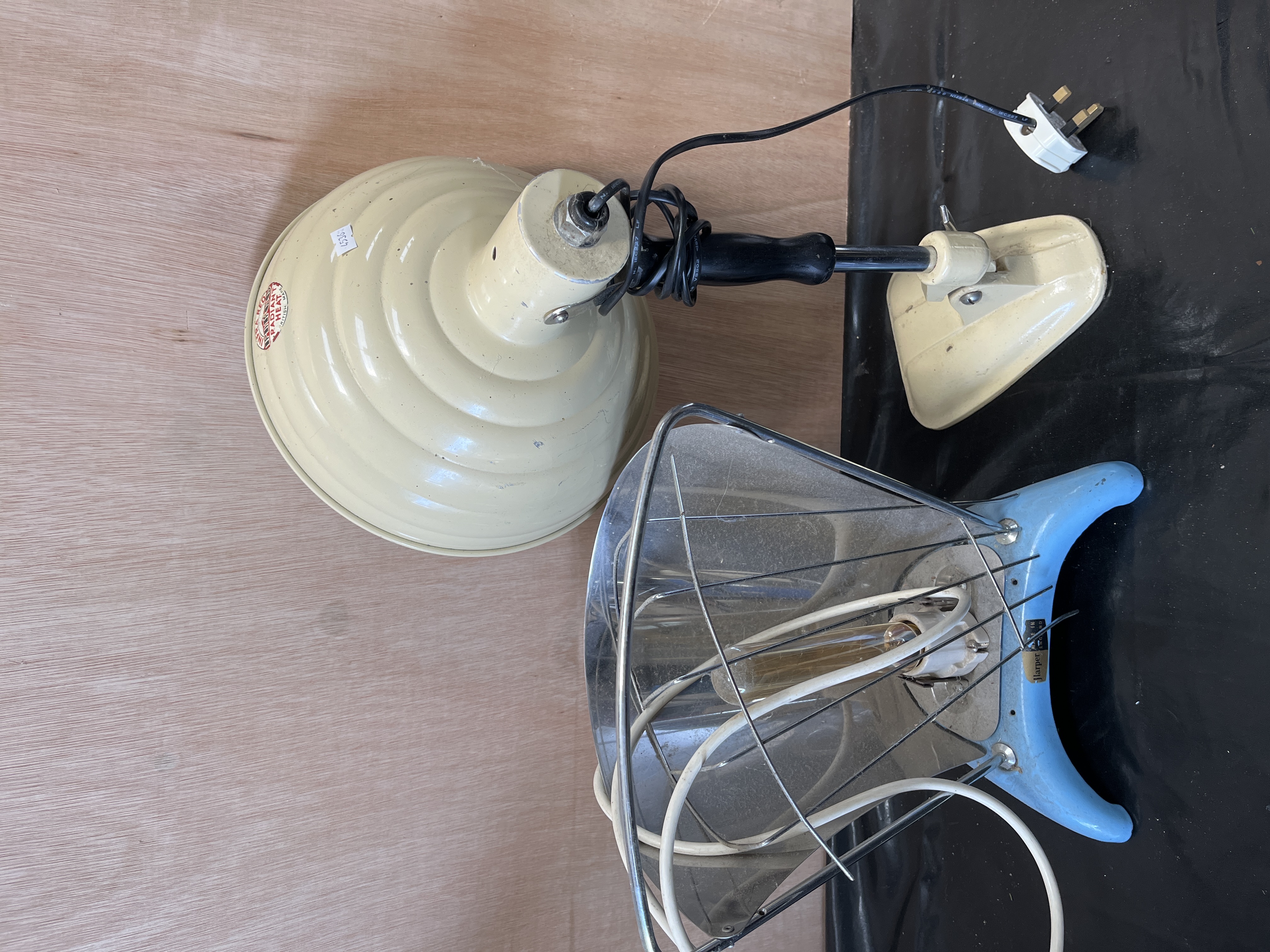 This lot comprises two mid-20th-century British electric heat lamps. The first is an adjustable infrared radiant heat lamp by Pifco, featuring a stepped, bowl-shaped metal reflector with a cream enamelled finish, a black plastic handle, and a chrome-finished adjustable arm. The reflector bears a circular red and black label marked INFRA RED PIFCO RADIANT HEAT BRITISH MADE. It is fitted with a black plastic-coated cable and a modern white UK three-pin plug. The second item is a portable electric heater by Harper, featuring a blue enamelled metal base, a black metal reflector, and a chrome-finished wire safety guard. The base is fitted with a small metal plaque marked Harper, and the reflector carries a sticker stating USE ONLY IN A VENTILATED ROOM. This item includes a white electrical cord. Both items are sold as historical or collectible objects and are electrically untested. Due to their age and original intended function as heating appliances, they should be professionally inspected, rewired, and PAT tested by a qualified electrician before any attempt is made to connect them to a power supply.