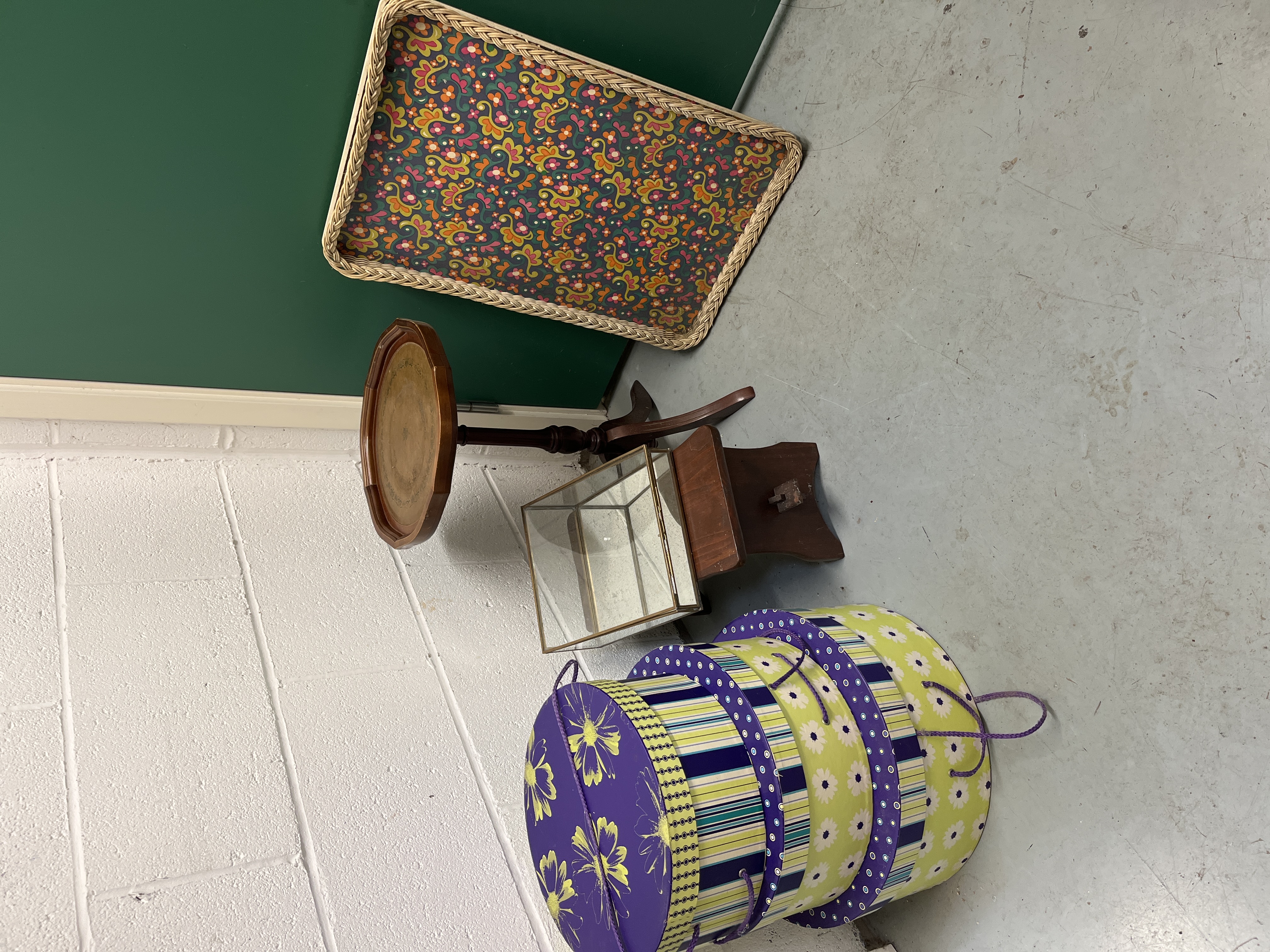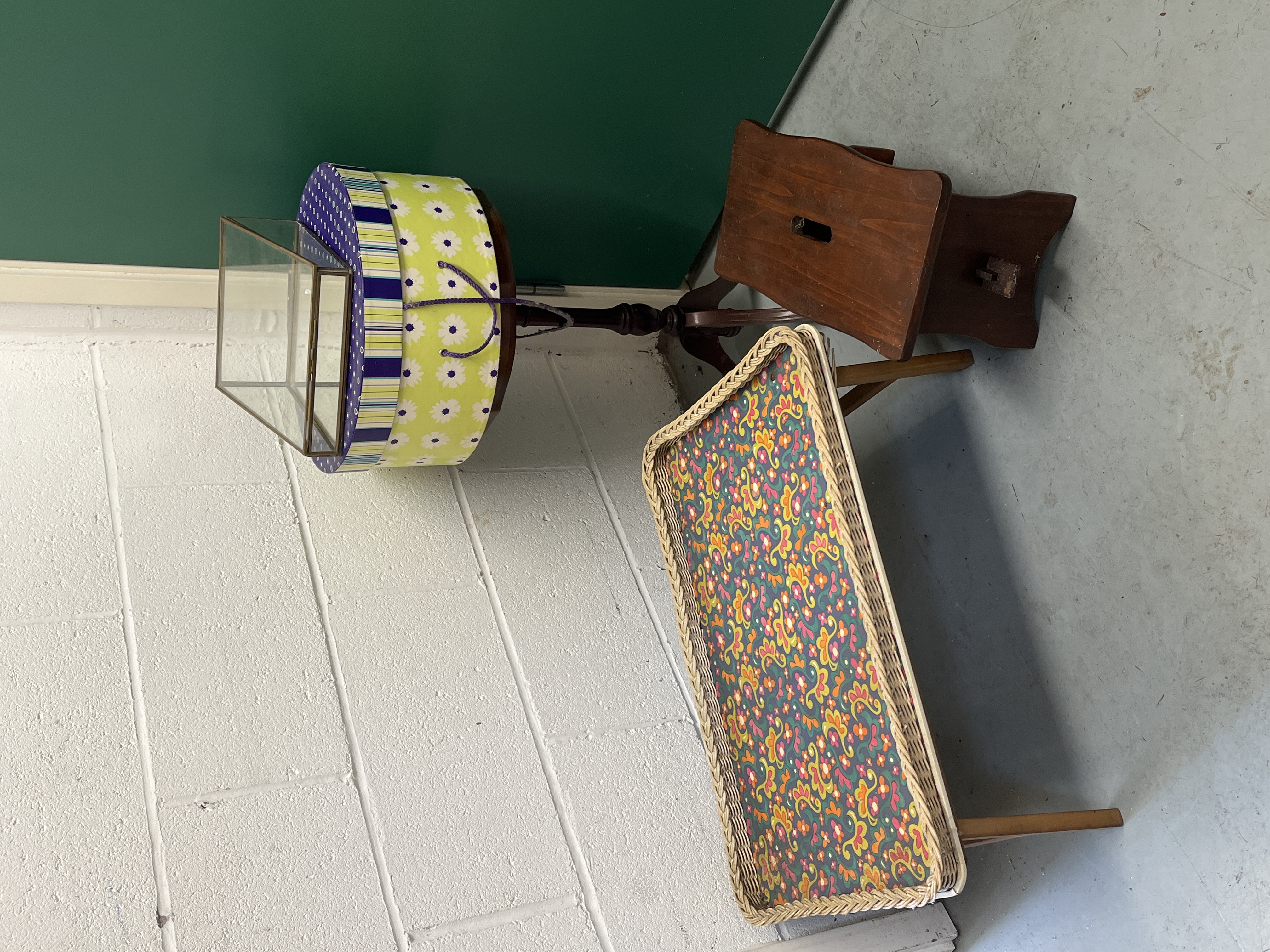An assortment of various furniture and decorative household items. The collection includes a small dark wood pedestal table featuring an inlaid circular top supported by a turned column on a tripod base. Also present is a simple stained wooden step stool with a central carry handle slot. Decorative items comprise a rectangular glass display case with a brass-toned metal frame and hinged lid, a rectangular tray with a woven wicker edge and a vibrant retro floral pattern, and several nested circular storage boxes decorated with various colourful floral, striped, and dotted designs. The items are constructed from materials including wood, glass, metal, and composite board. No maker’s marks or inscriptions are visible.