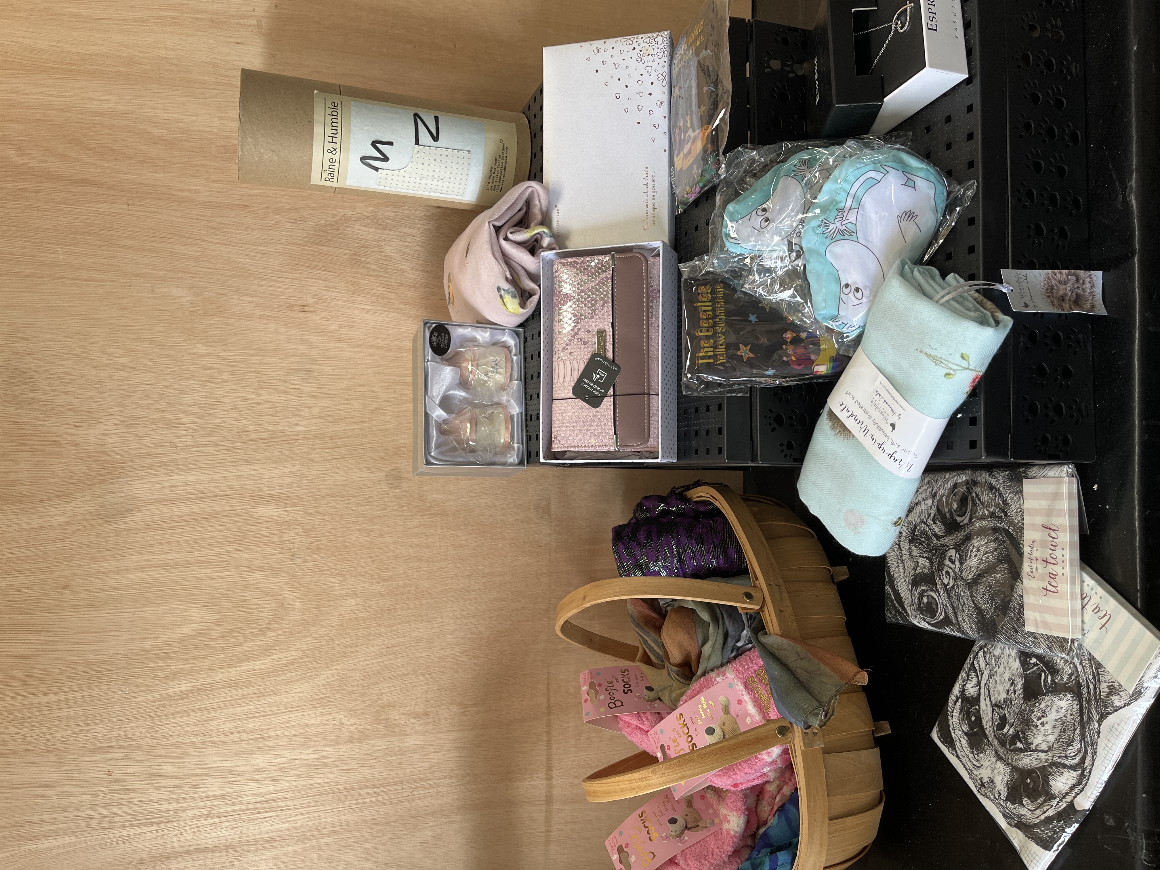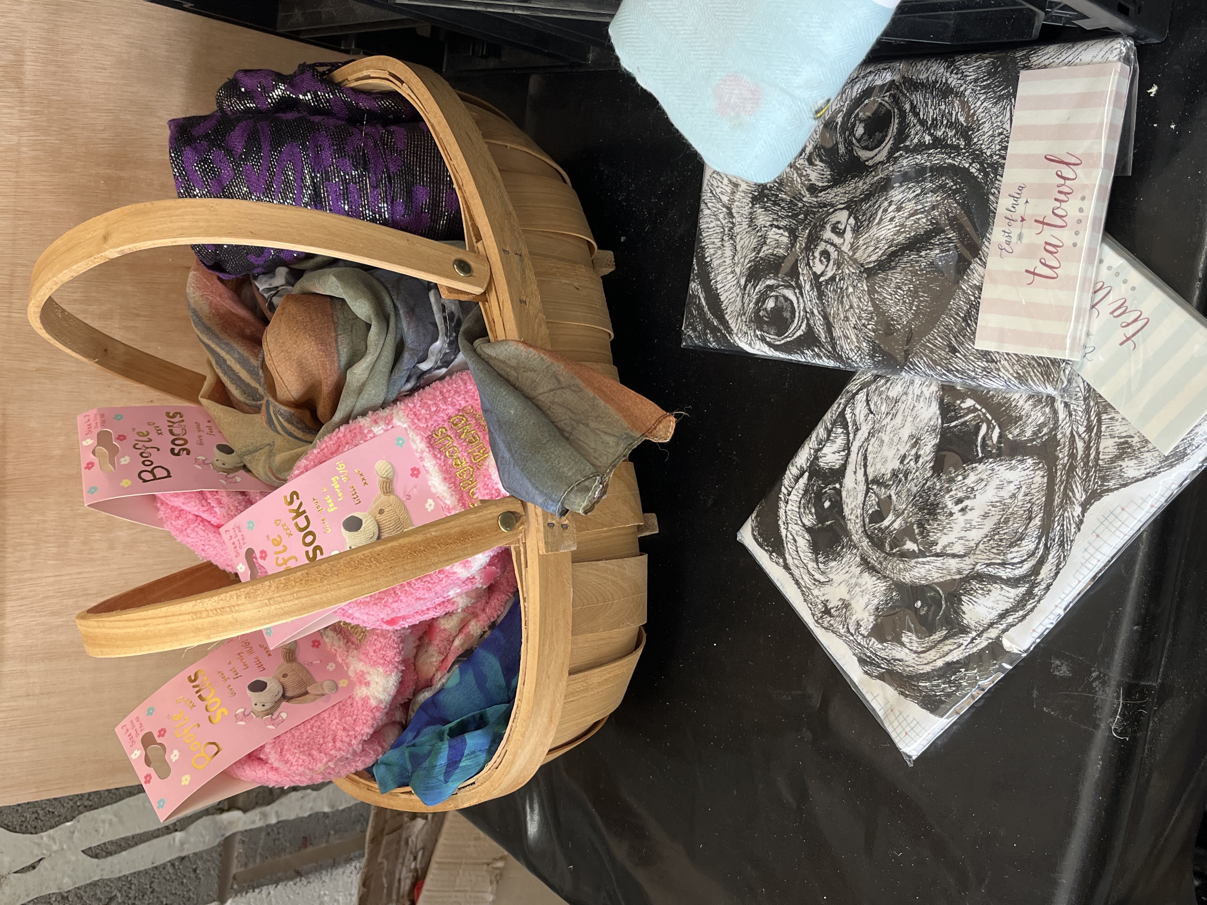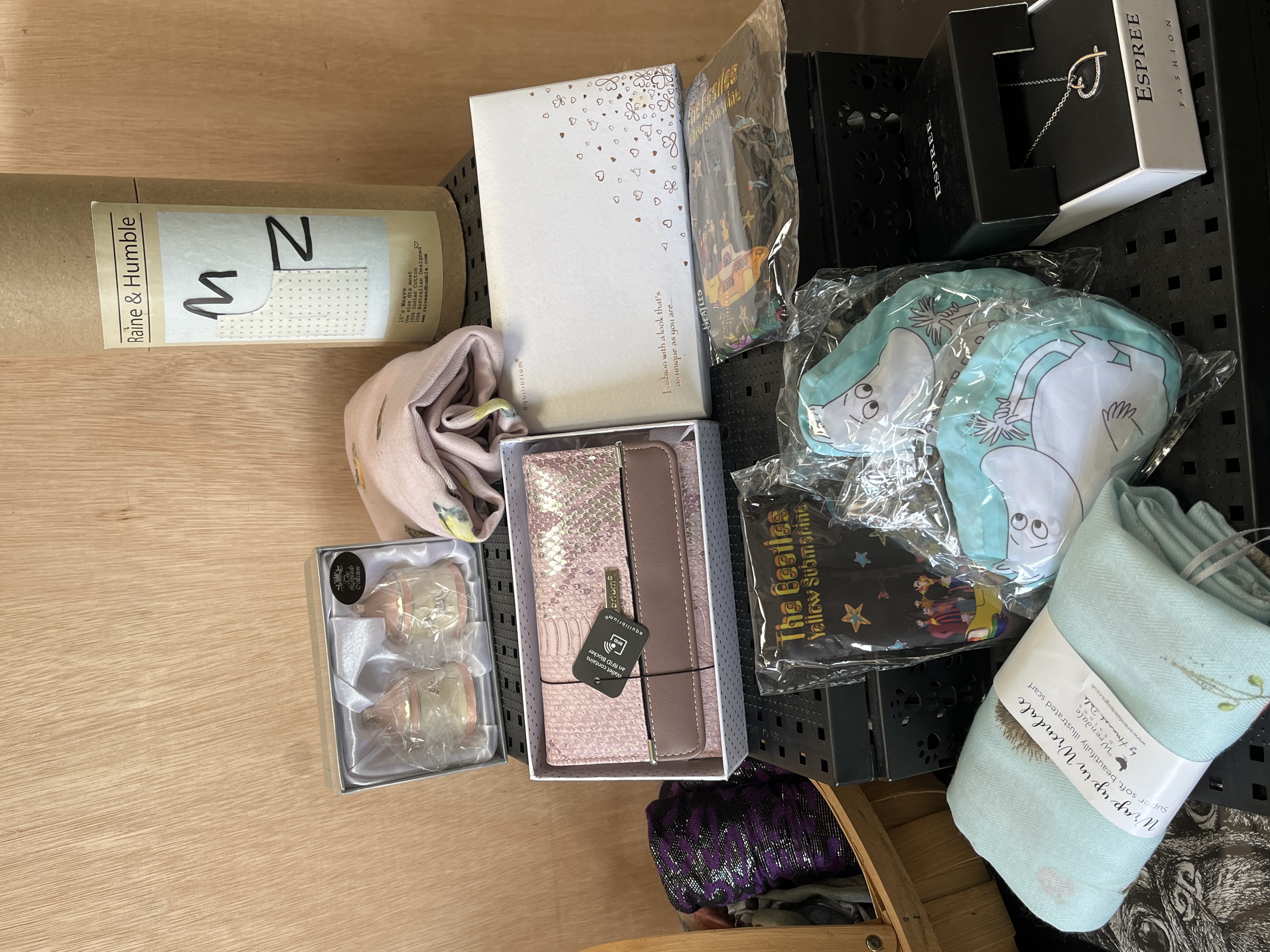 This lot consists of assorted giftware, textiles, and accessories, primarily comprising liquidation or overstock goods. The collection includes a Wrap up in Wrendale hedgehog-design scarf, two East of India pug-themed tea towels, and an equilibrium pink textured wallet housed in a white presentation box. Also present is a boxed Espree Fashion necklace and a boxed set of two decorative votive holders. Licensed merchandise includes The Beatles Yellow Submarine and Moomin themed accessories in protective plastic sleeves. A wooden handled chipwood basket contains three pairs of Boofle brand socks with retail tags and several loose patterned scarves. The lot is completed by a Raine and Humble cardboard tube containing a textile item. Items are constructed from various materials including cotton, synthetic textiles, wood, and metal.