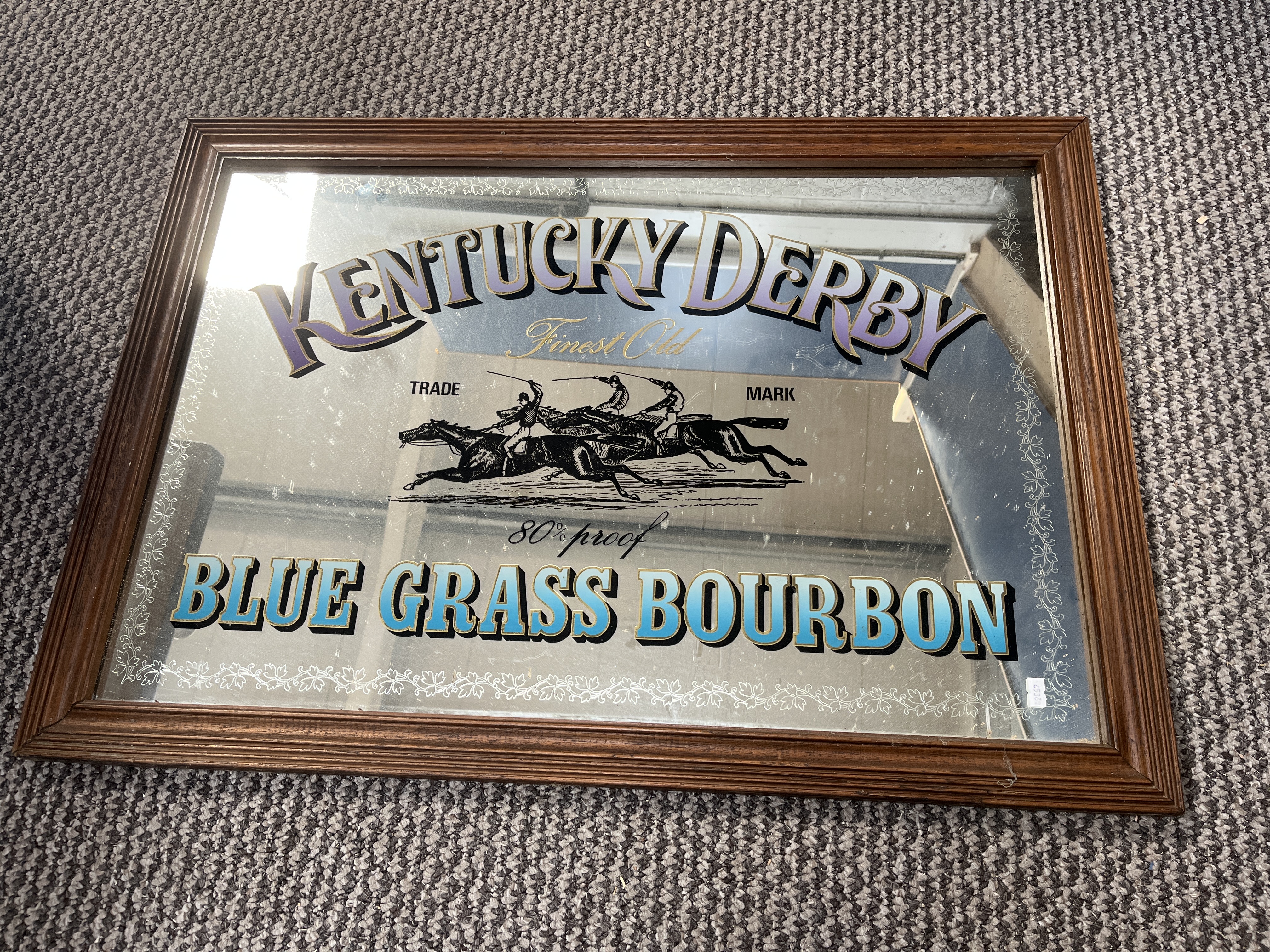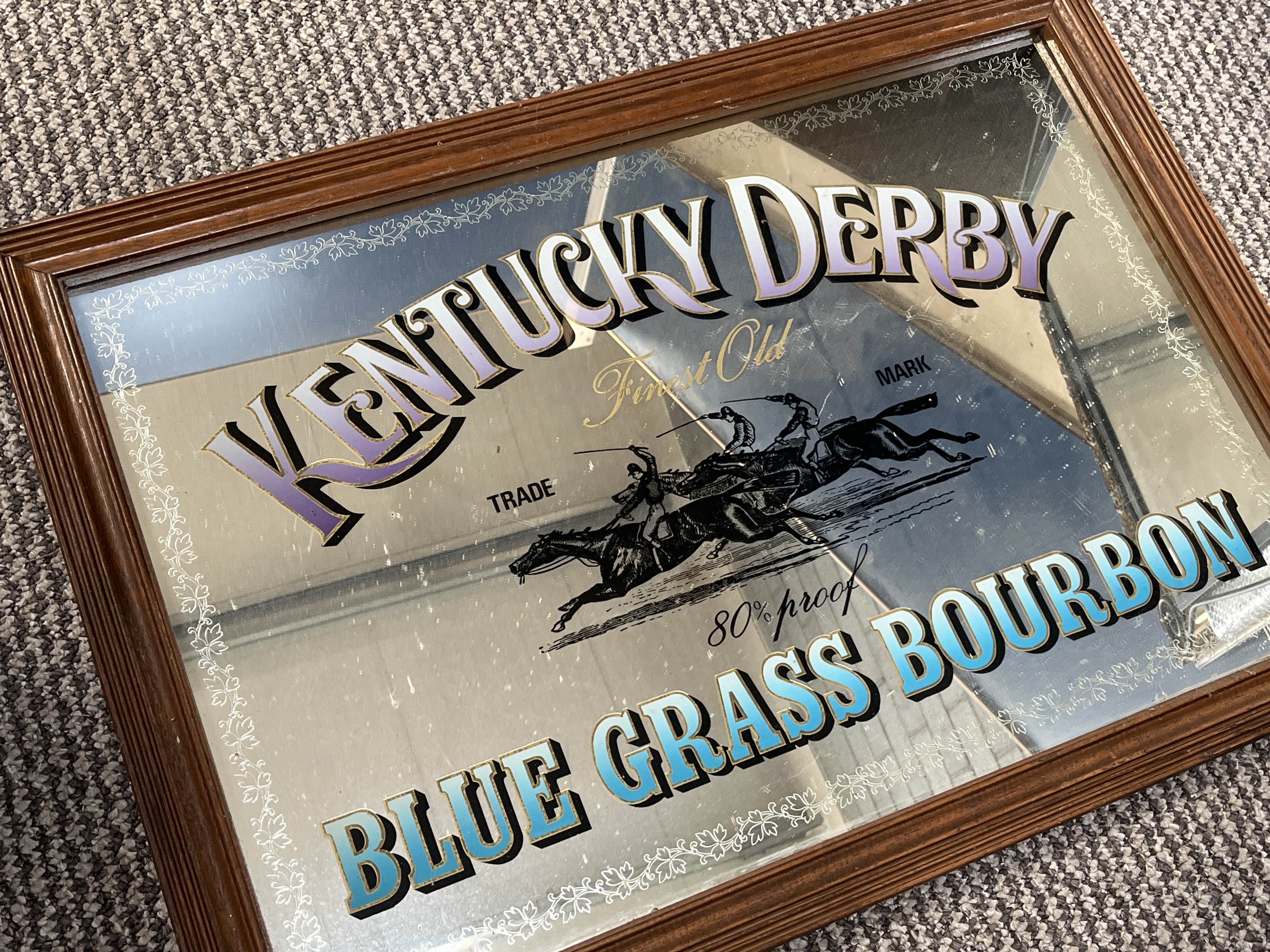 A late 20th-century advertising pub mirror for Kentucky Derby Blue Grass Bourbon. The rectangular glass mirror is housed in a dark-stained moulded wooden frame. The central graphic depicts three racing horses with jockeys in black ink, flanked by the words TRADE and MARK. The upper text reads KENTUCKY DERBY in an arched serif font with purple and gold-toned gradients, above the phrase Finest Old in gold-coloured cursive script. The lower portion features the text 80% proof in black script and BLUE GRASS BOURBON in large block serif letters with a blue-to-white gradient and gold-coloured outlining. A decorative white foliate border runs around the perimeter of the glass.